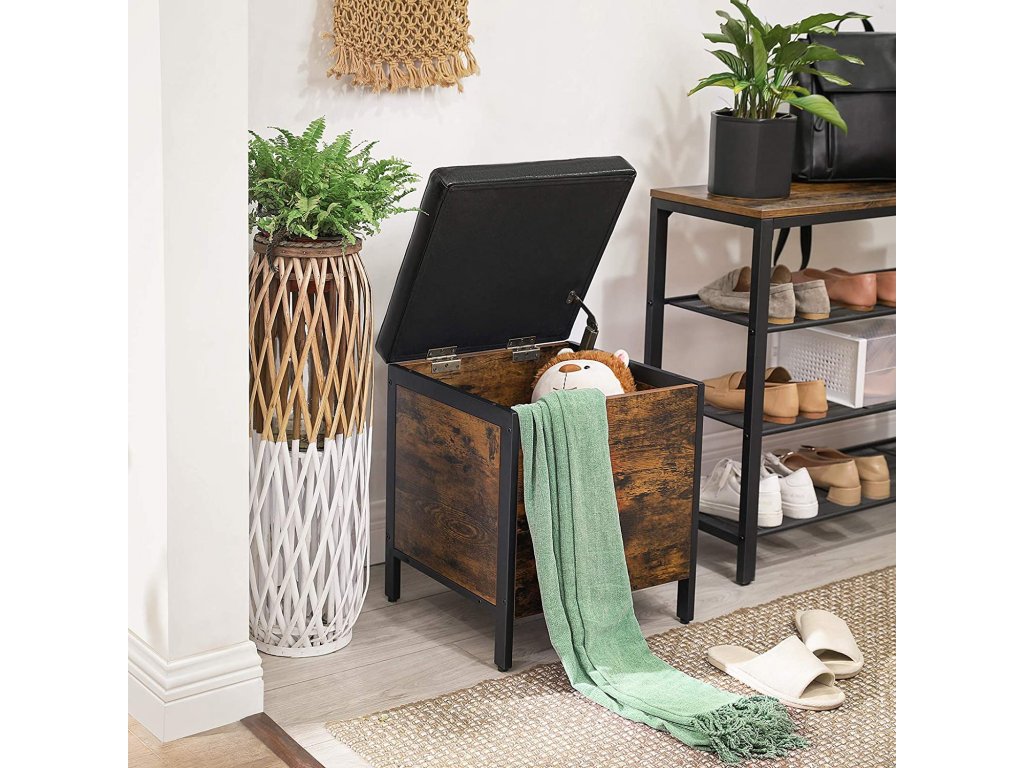 Útulná stolička s měkkým umělým koženým potahem, stylová úložná varianta s prastarým kouzlem a atraktivní dekorativní prvek s černým kovovým rámem.