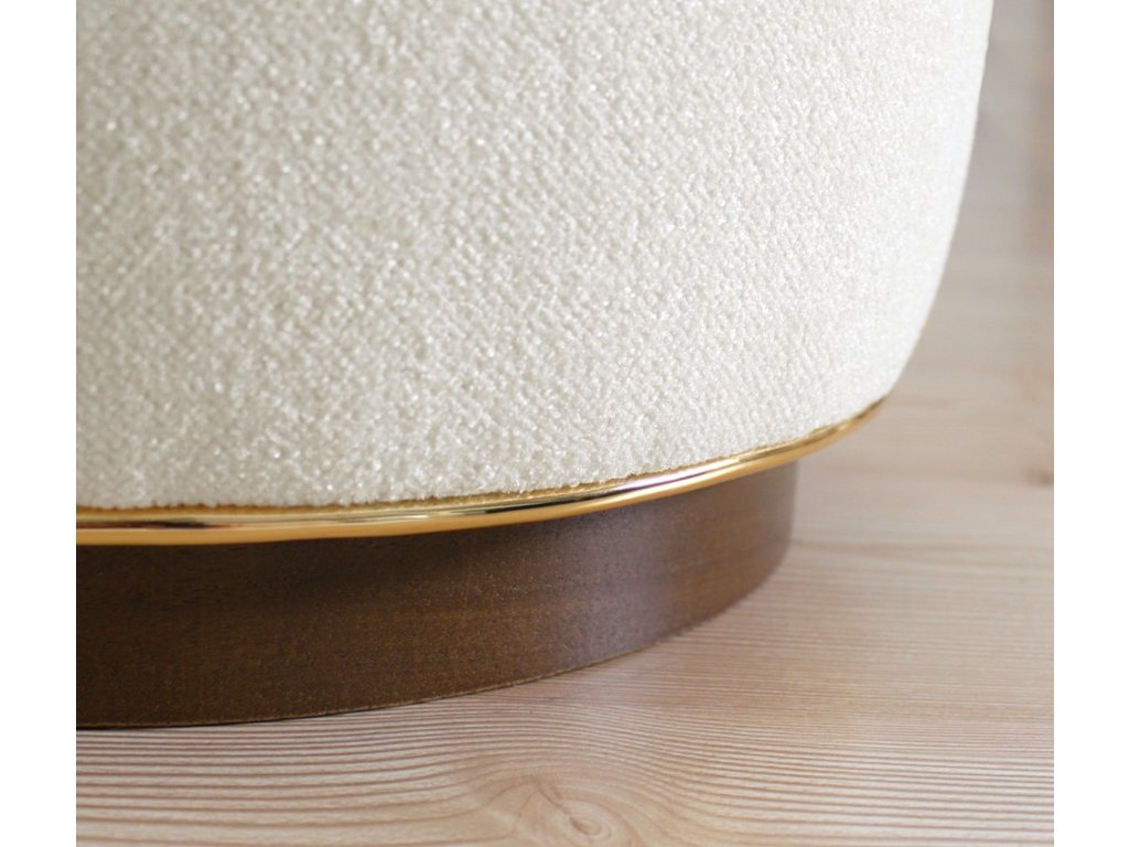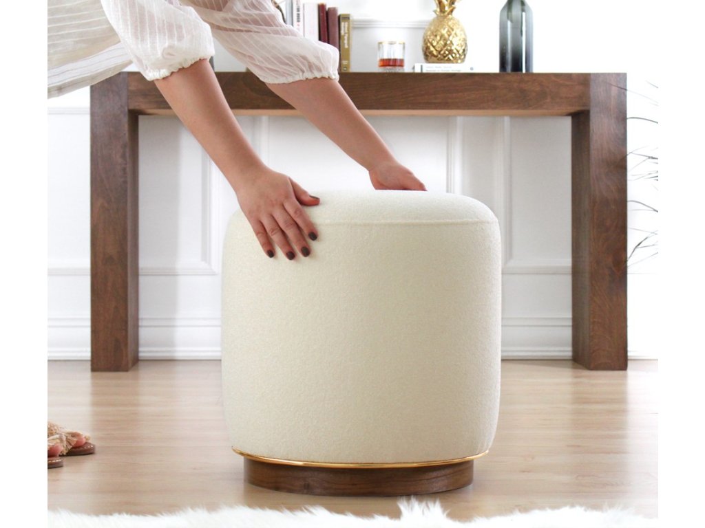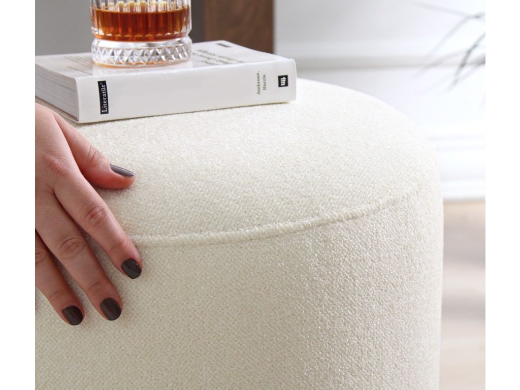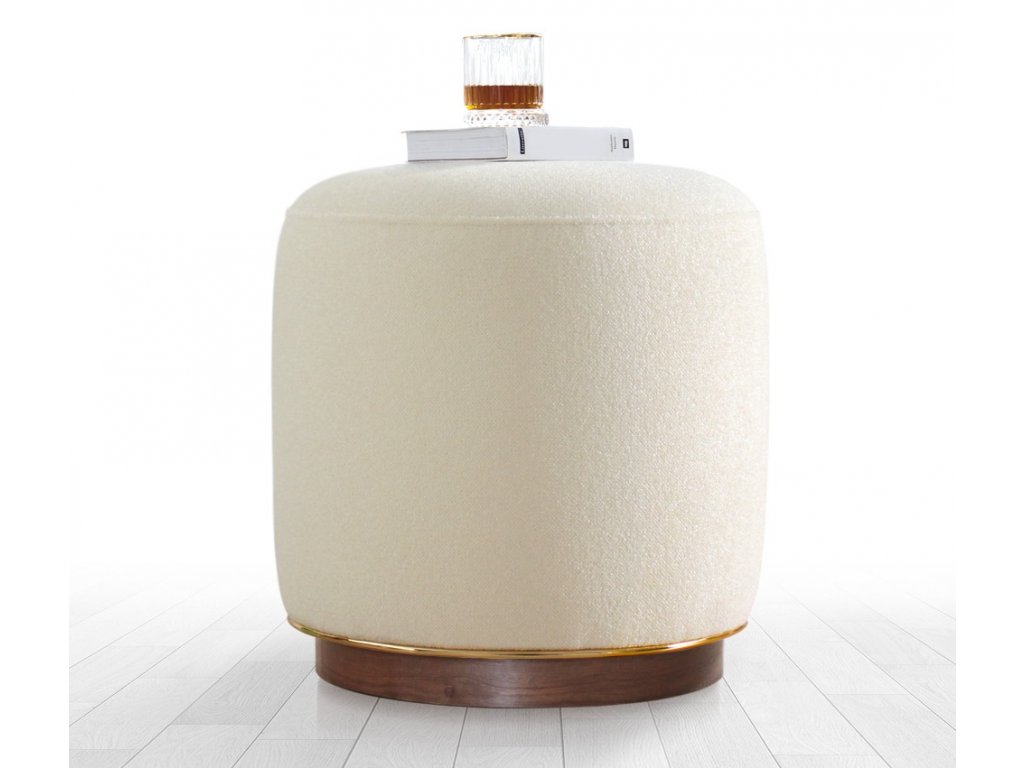 Válcový taburet čalouněný bavlněnou látkou s příjemnou krémovou barvou.