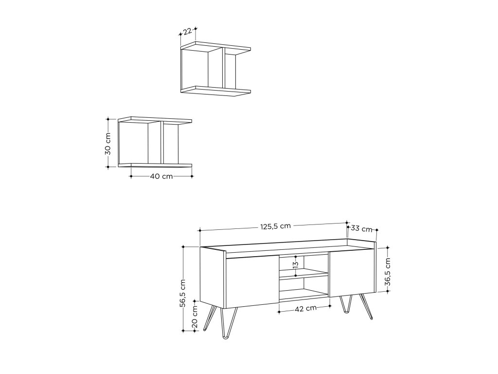 Rozměry: Šířka: 125,5 cm Výška: 56,5 cm Hloubka: 33 cm Výška nohou: 20 cm