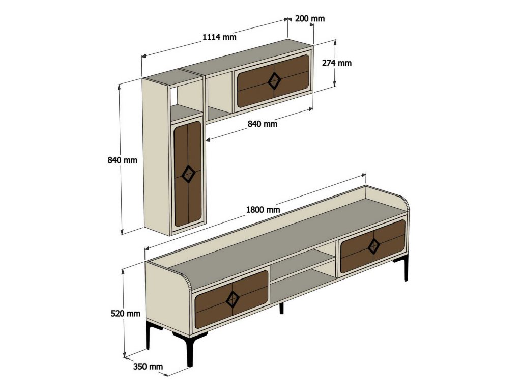 Spodní část televizní stěny SAMBA je tvořena středovým regálem a dvěma uzavíratelnými skříňkami s černými madly a k nim náleží dvě nástěnné police v témže designu.