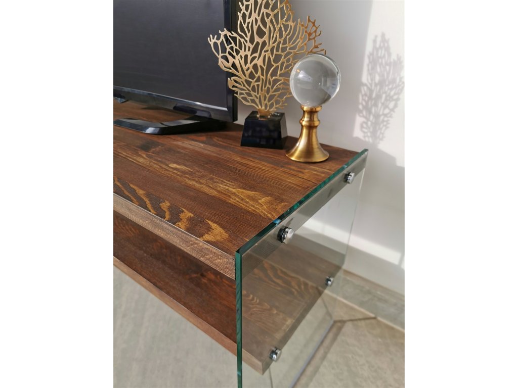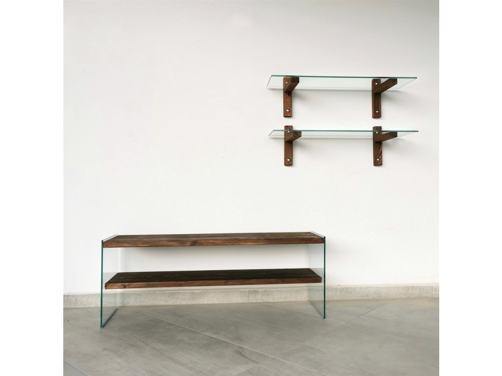Je vyrobena z tvrzeného 8 mm silného skla a z borovicových desek pokrytých dekorem ořech.