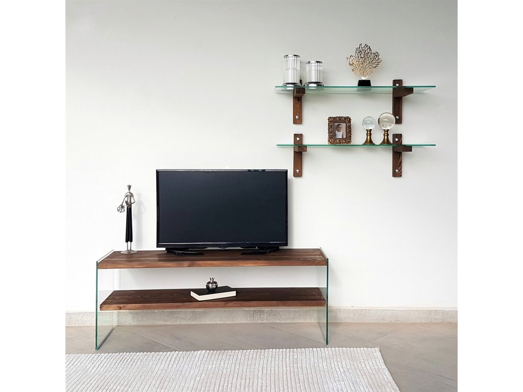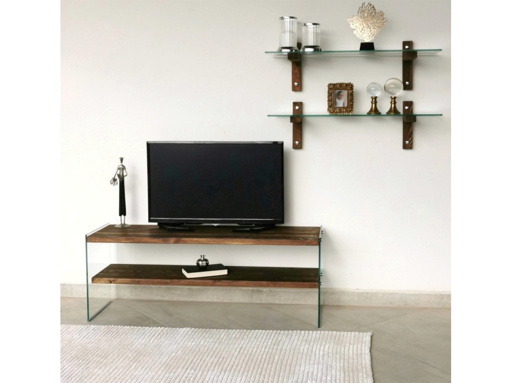 Televizní stěna TV105 je vyrobená ze skleněných a do dekoru ořech oděných borovicových desek a skládá se ze dvou nástěnných polic a televizního stolku tvořeného skleněnými bočnicemi a dvěma borovicovými policemi.