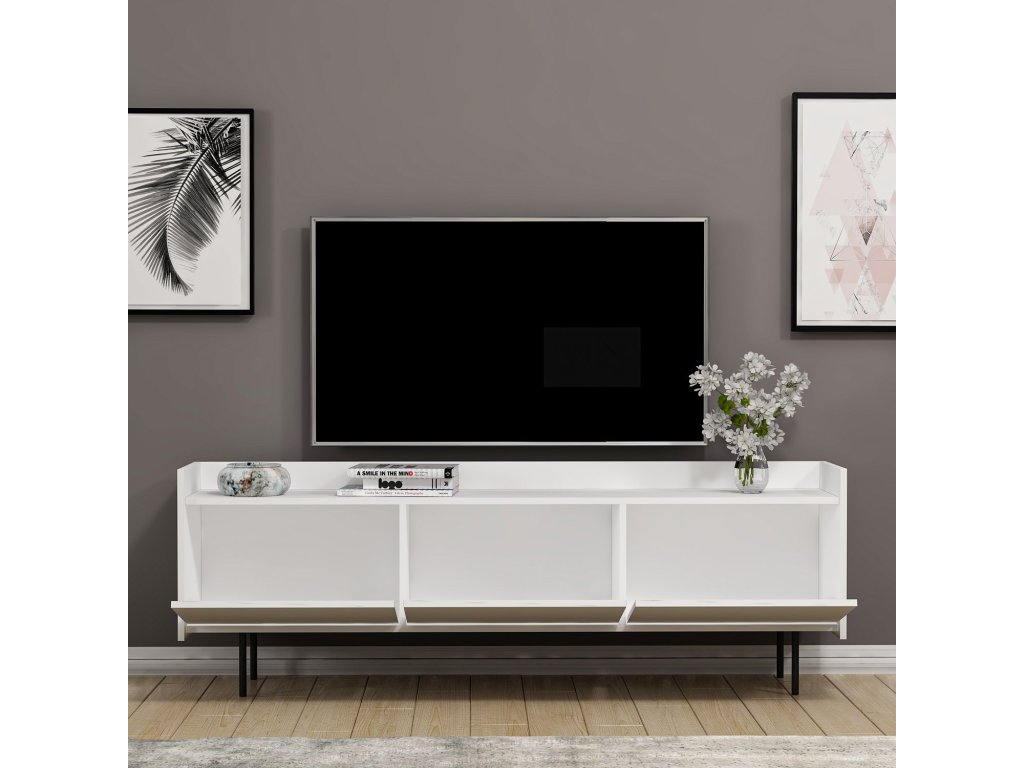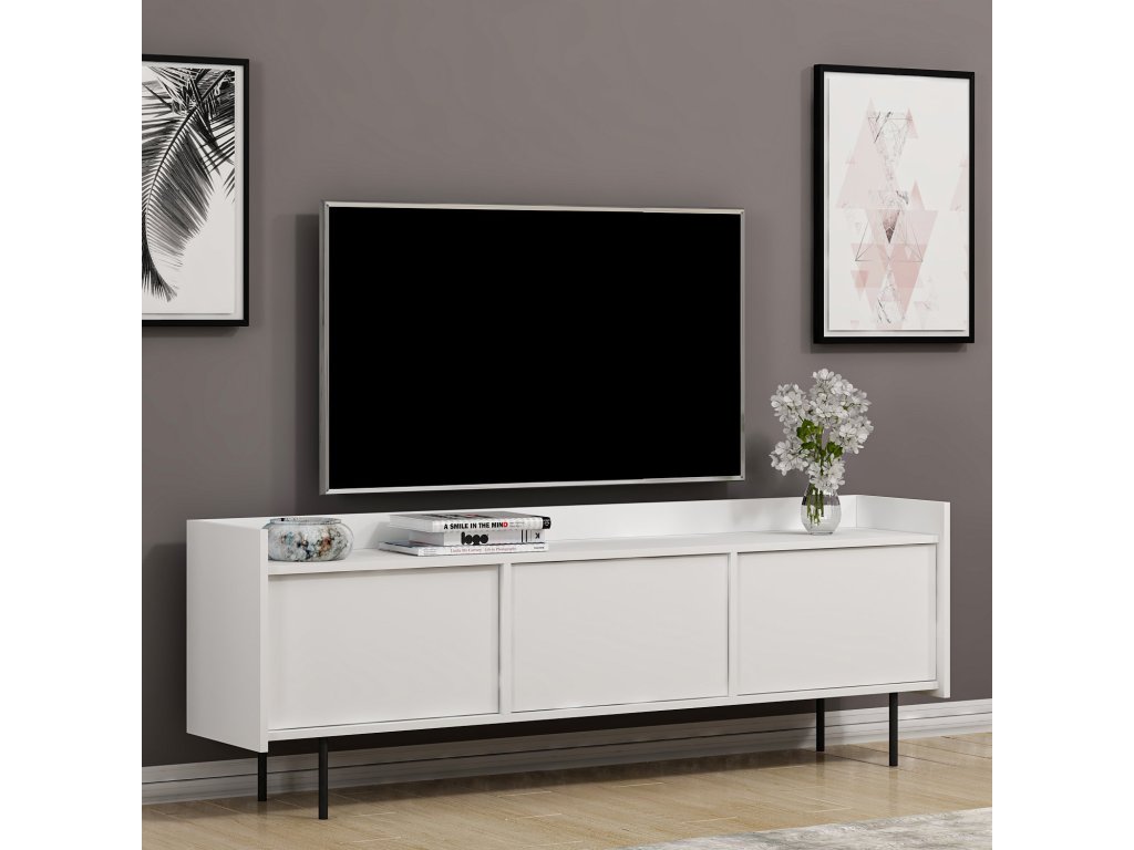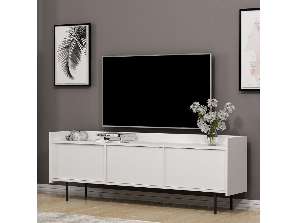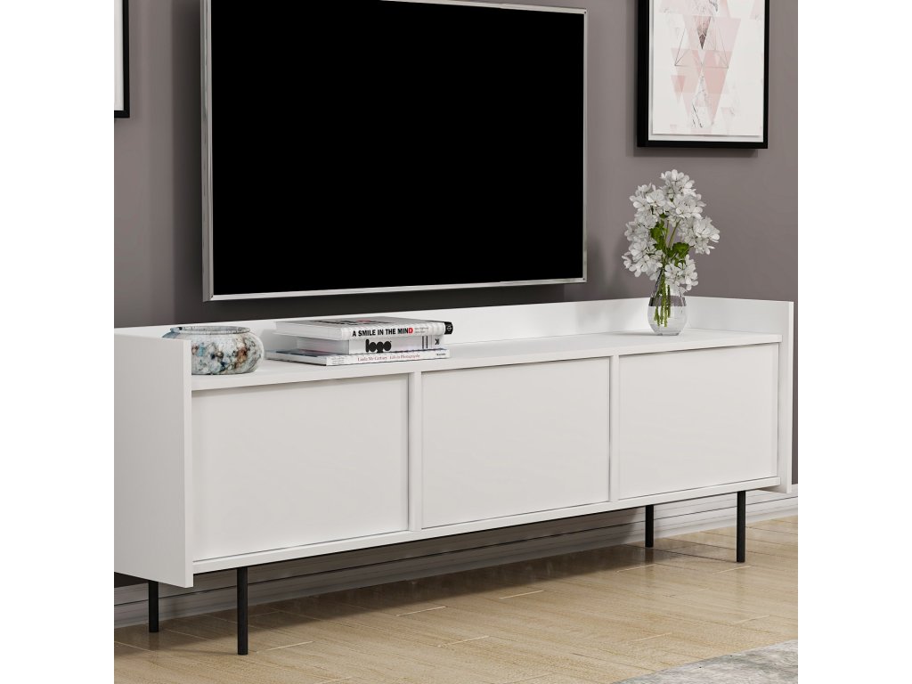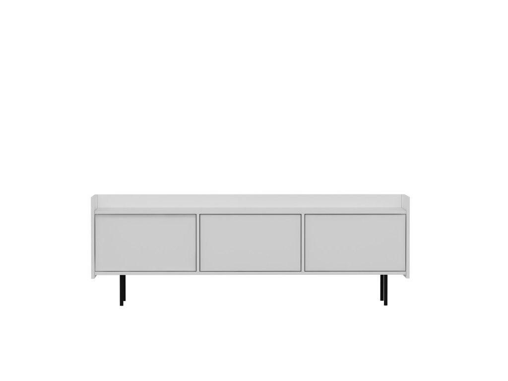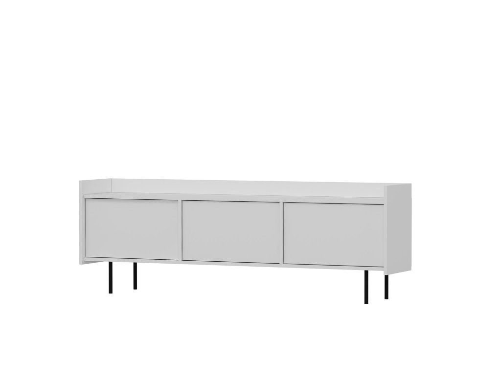 Bílý televizní stolek ATLAS je tvořen třemi skříňkami s vyvýšenými postranicemi, které tak dávají tušit vymezený prostor pro televizor.