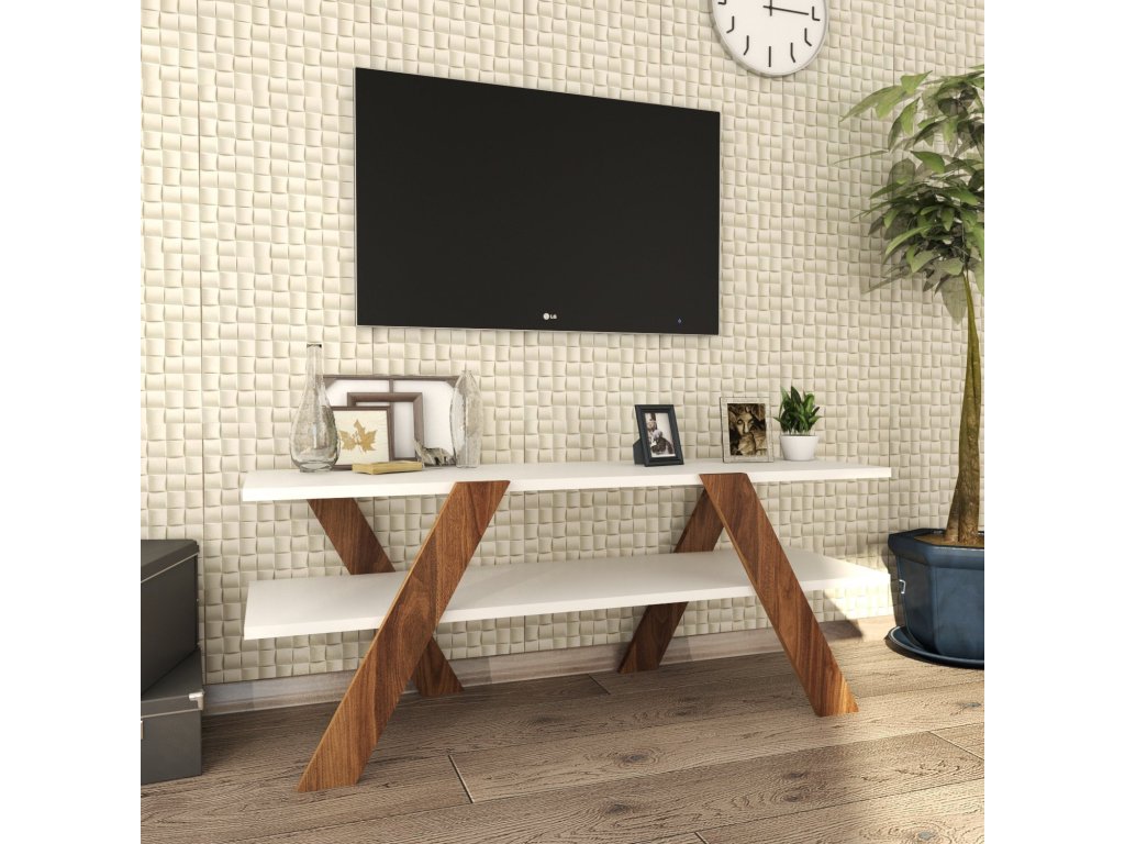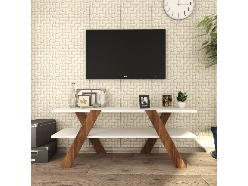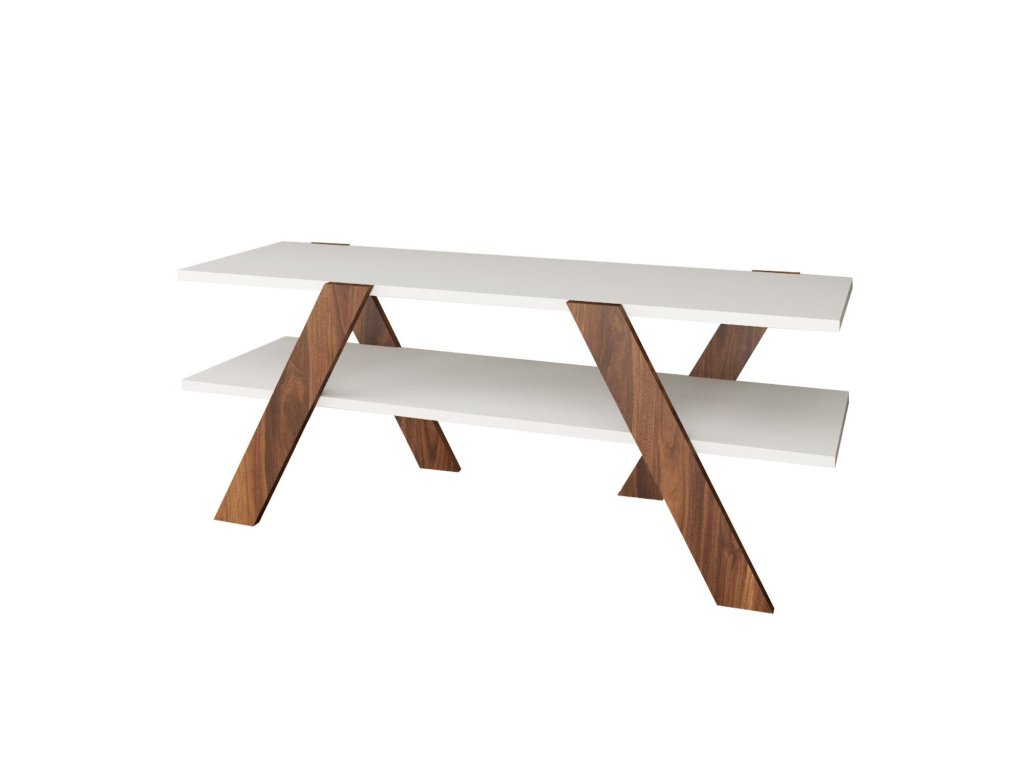 První, čeho si u televizního stolku BASIC všimnete, jsou příčné dřevěné nohy nesoucí dvě bílé police.
