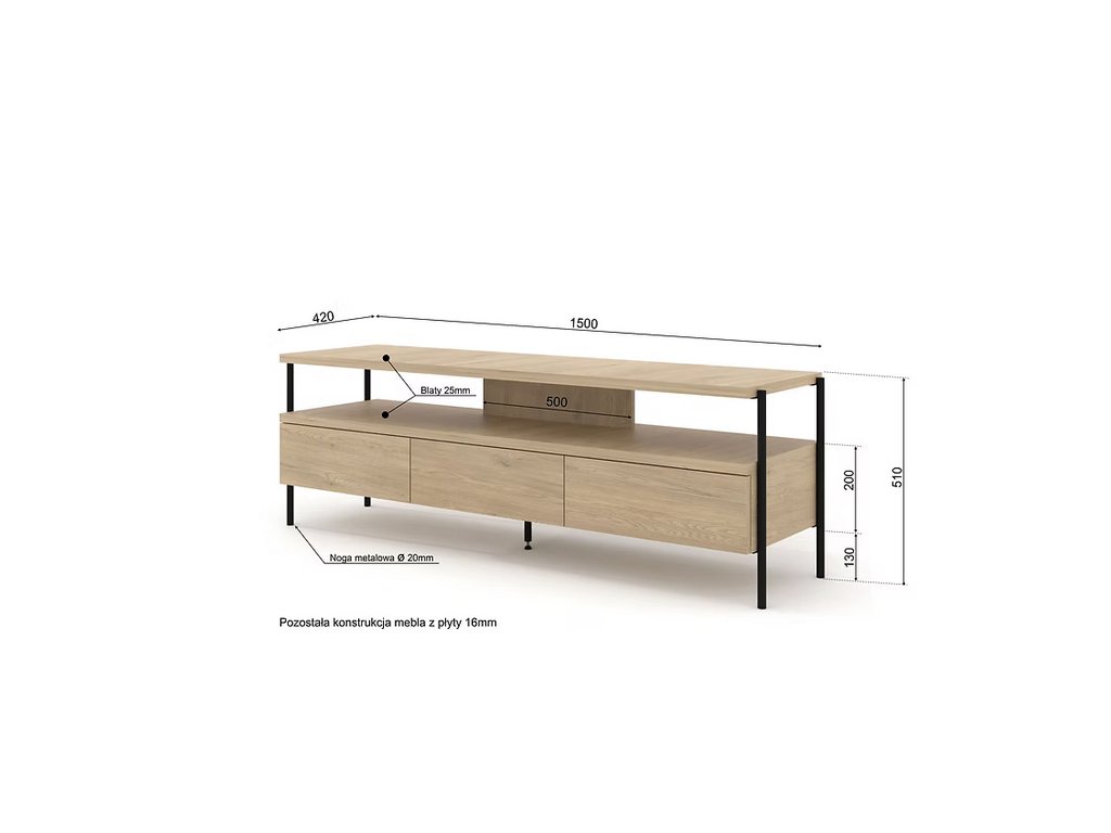 - materiál: korpus - laminovaná deska 16 mm, zesílená horní deska o tloušťce 25 mm, zadní panel z HDF desky v barvě korpusu