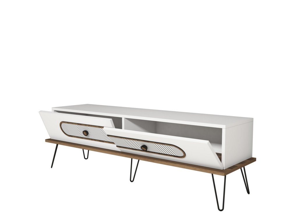 Skládá se z horní desky pro televizi a dvou uzavíratelných dvířek kam se vejde všechno příslušenství a neruší tak celkový dojem stolku.