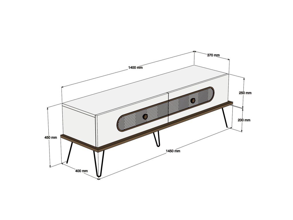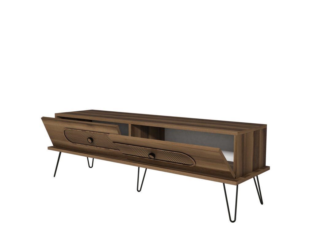 EKOL je víceúčelový televizní stolek v dekoru ořech tvořen nosnou deskou s černýma kovovýma nohama a dvěma spojenými skříňkami s výklopnými dvířky, na kterých je designový ozdobný CNC reliéf v hloubce 4 mm.