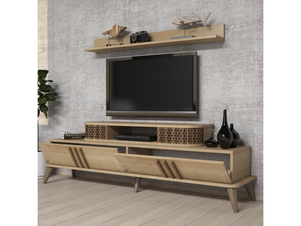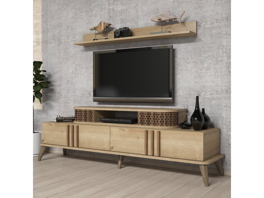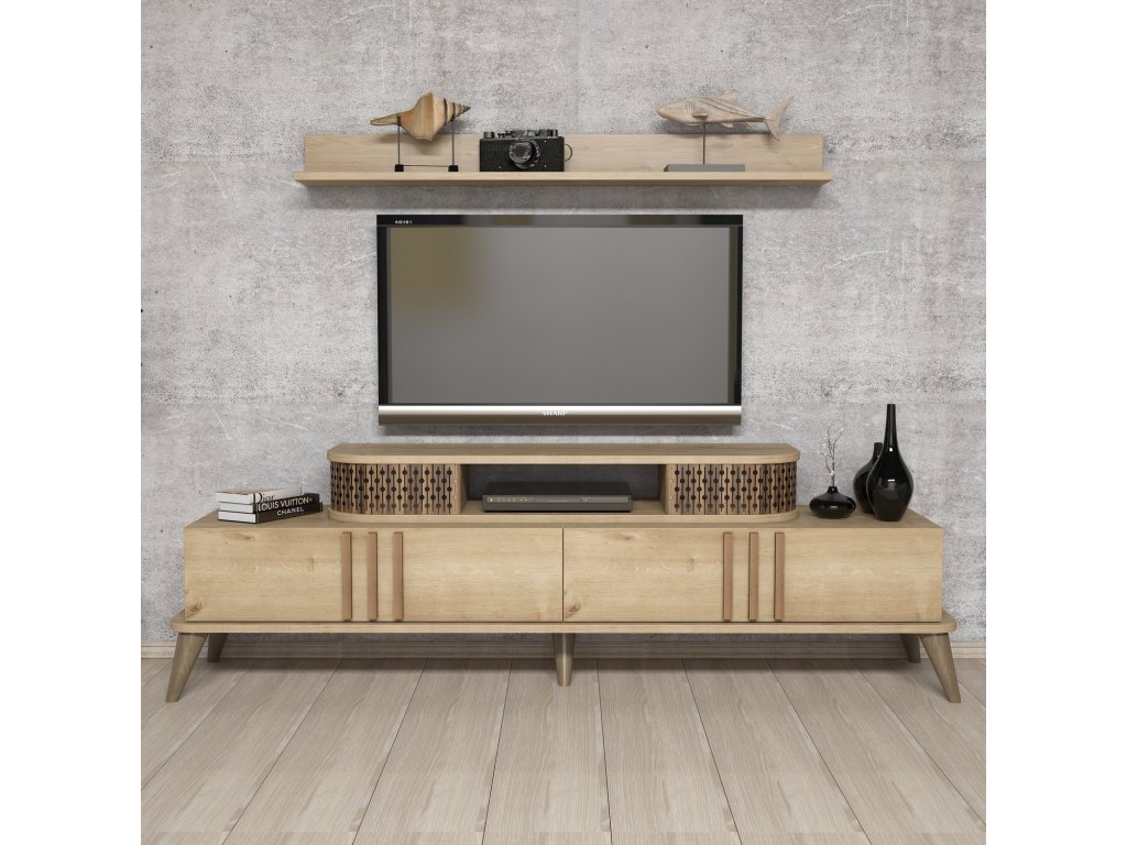 EYLUL je symfonií dubového dekoru přetvořeného v moderní televizní stolek a příslušnou nástěnnou polici.