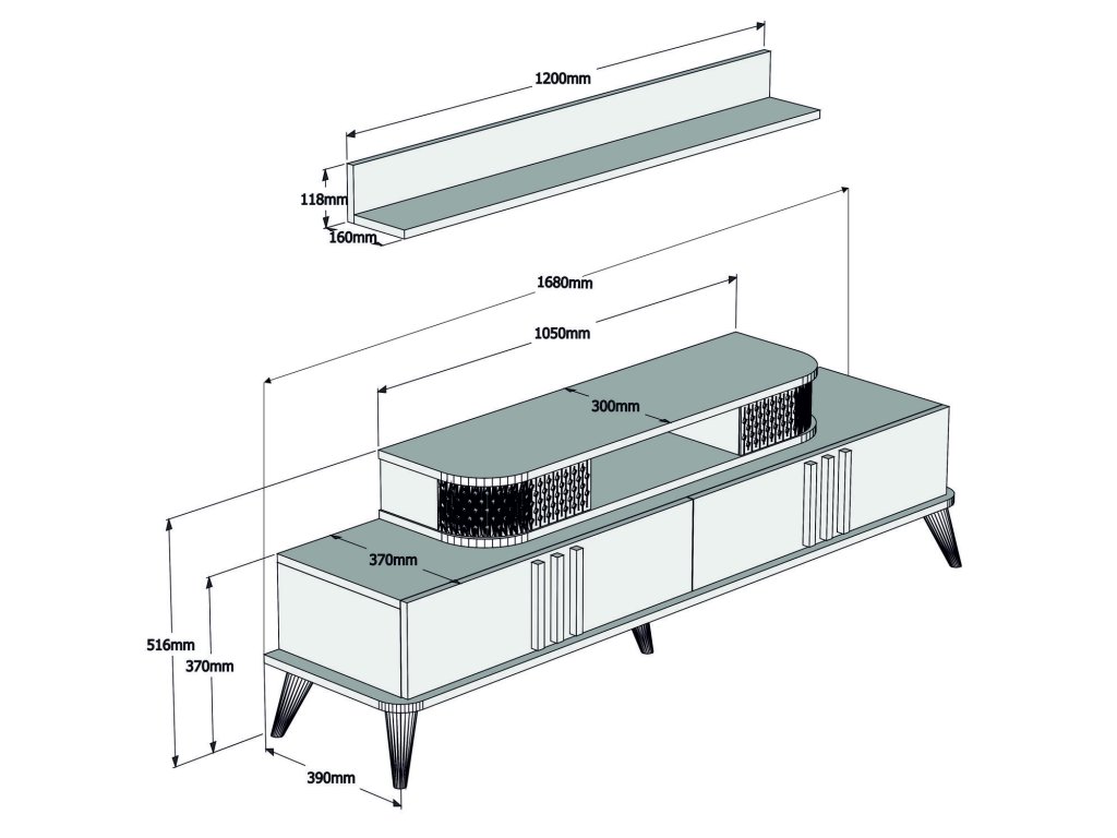 Rozměry TV jednotky: Šířka: 168 cm Hloubka: 39 cm Výška: 51,6 cm