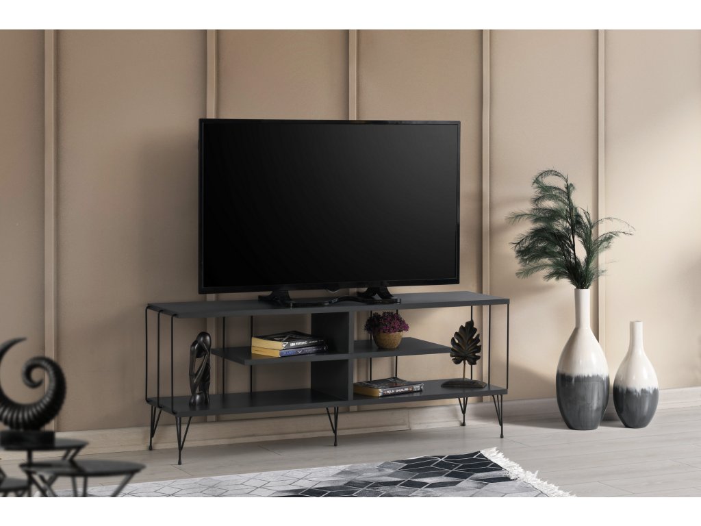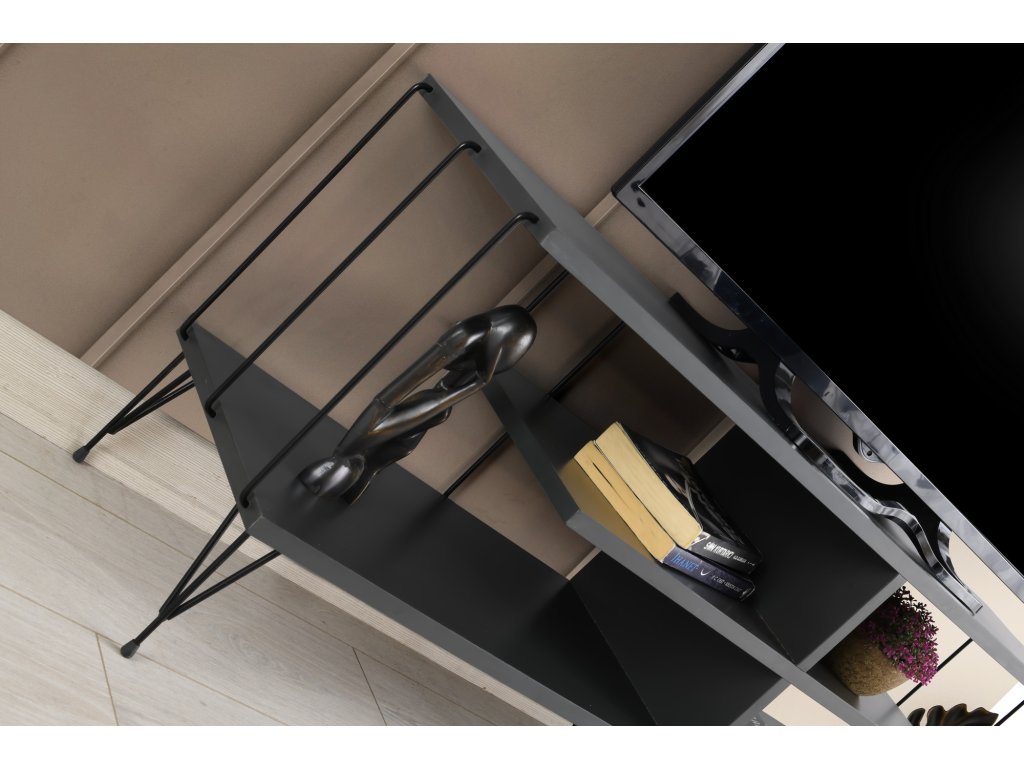 Stolek má kovovou, stabilní konstrukci a police v dekoru antracit.