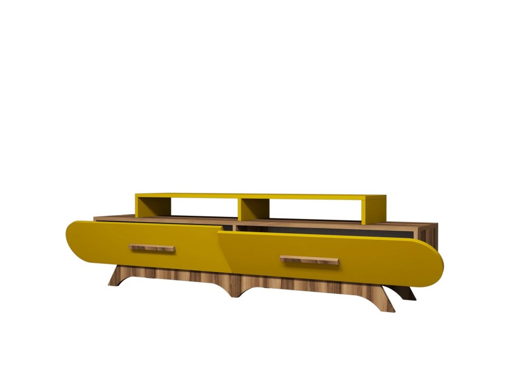 Netradiční televizní stolek s poličkami a úložným prostorem nadchne Vás svým neobvyklým provedením moderního designu v barevném provedení dekor ořech a žlutá.