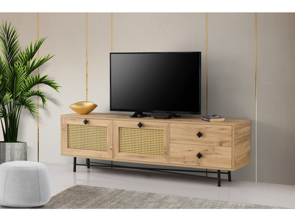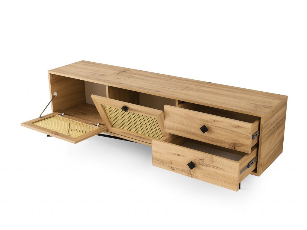 HAPSIAS je prostorný televizní stolek s dvěma úložnými prostory a dvěma zásuvkami.