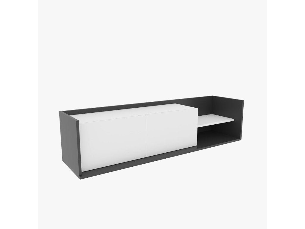 Bílo-antracitový televizní stolek KROG je vybaven jednou policí a dvěma skříňkami s výklopnými dvířky usazenými hlouběji do stěn stolku a tím je kolem prostoru pro televizor vytvořen jemný mantinel.