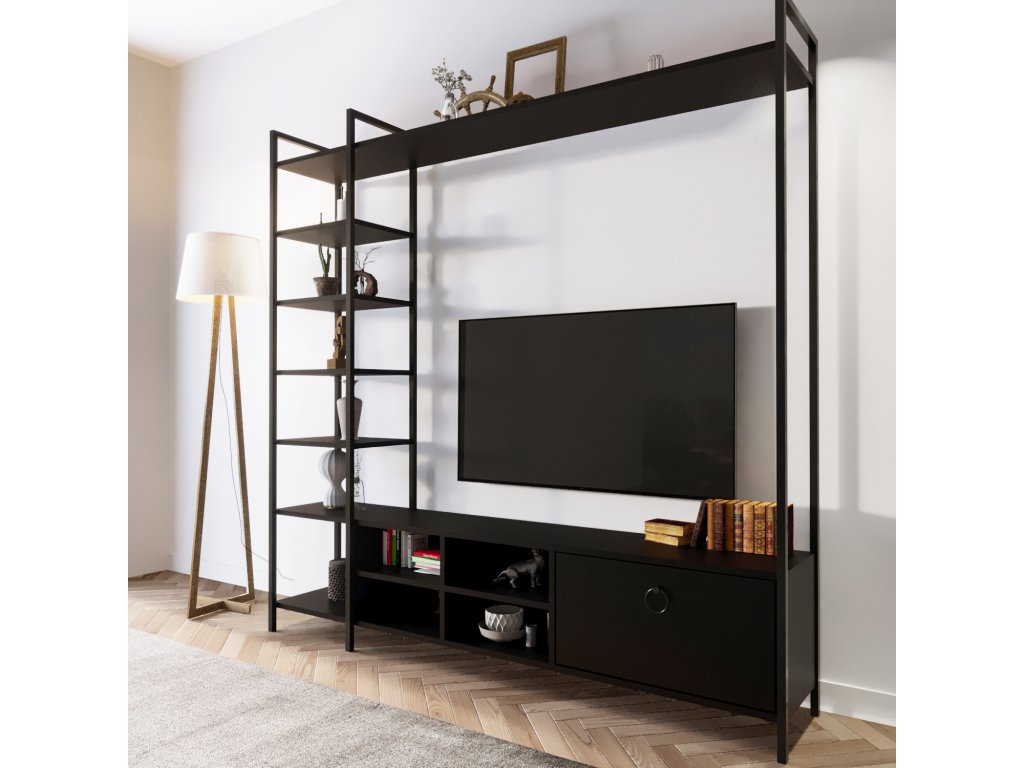 Černá moderní televizní stěna L515 je připravená potěšit i náročnější uživatele a nabídnout dostatek otevřeného úložného prostoru.