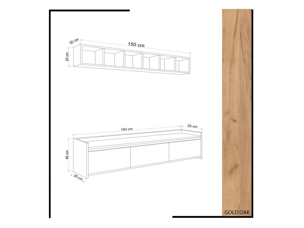 Celkové rozměry TV jednotky: Šířka: 150 cm Hloubka: 35 cm Výška: 45 cm