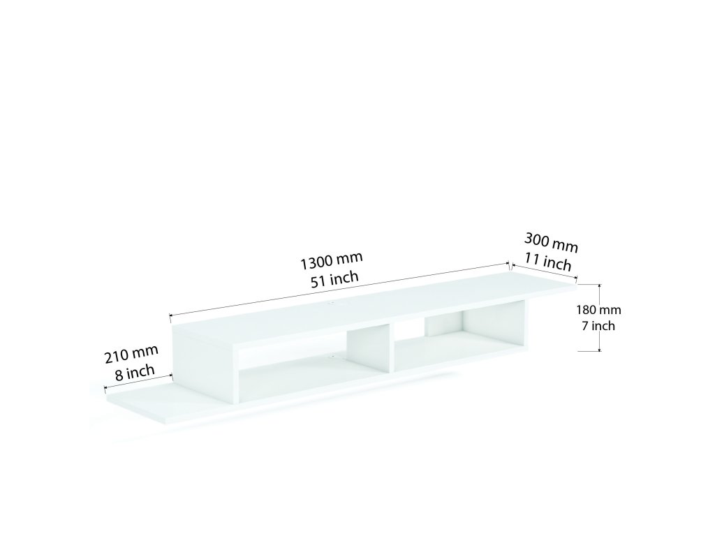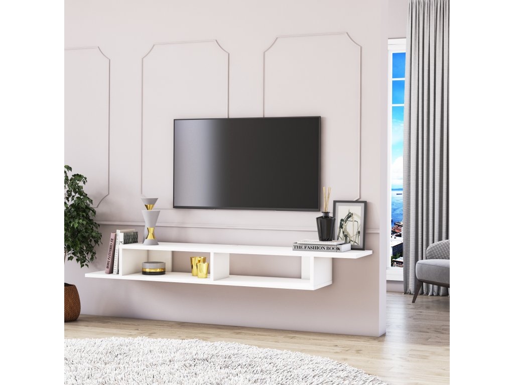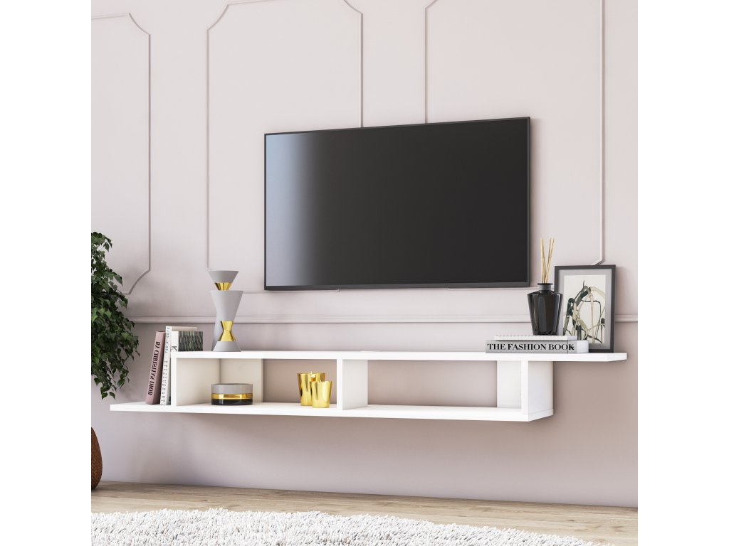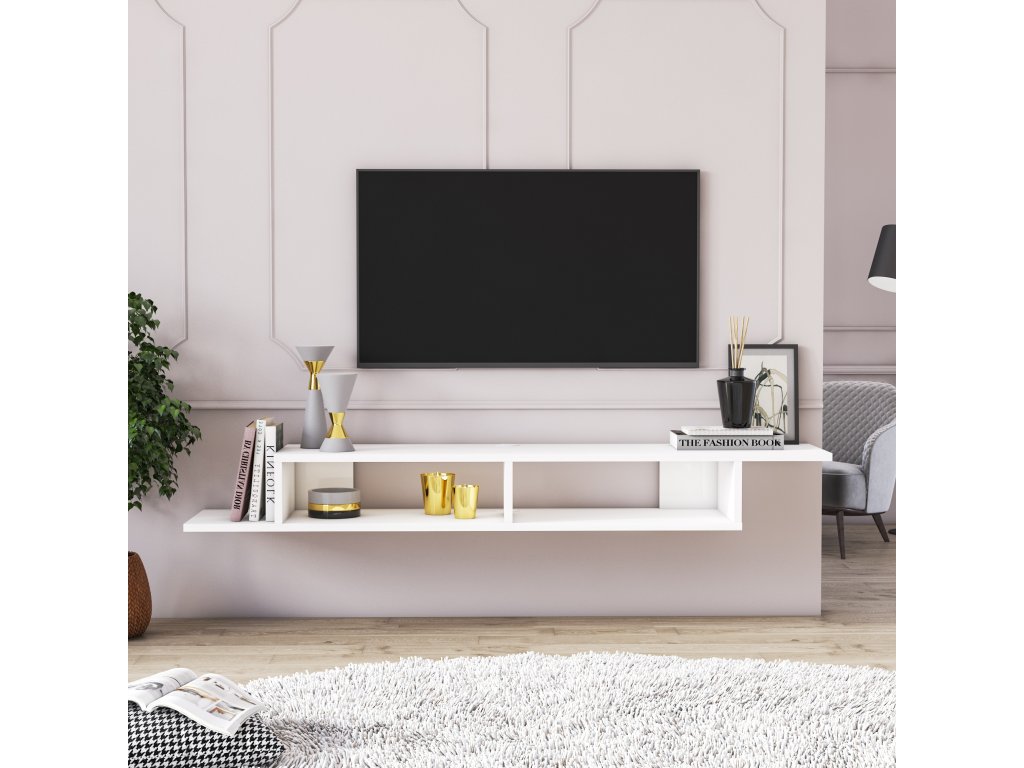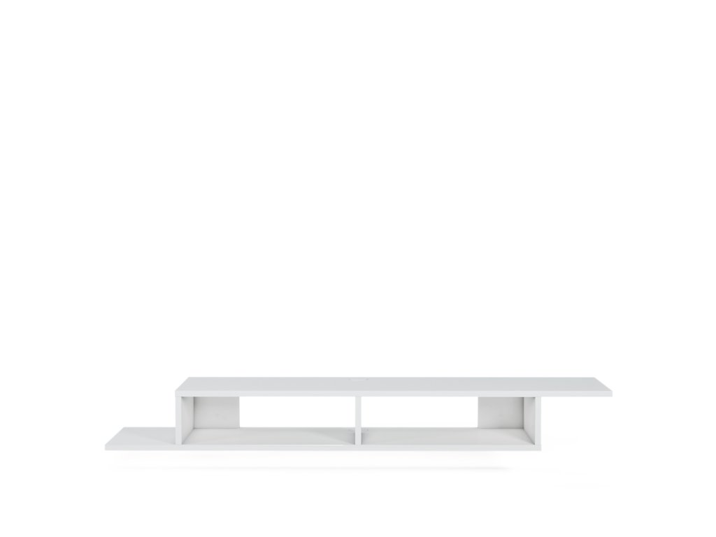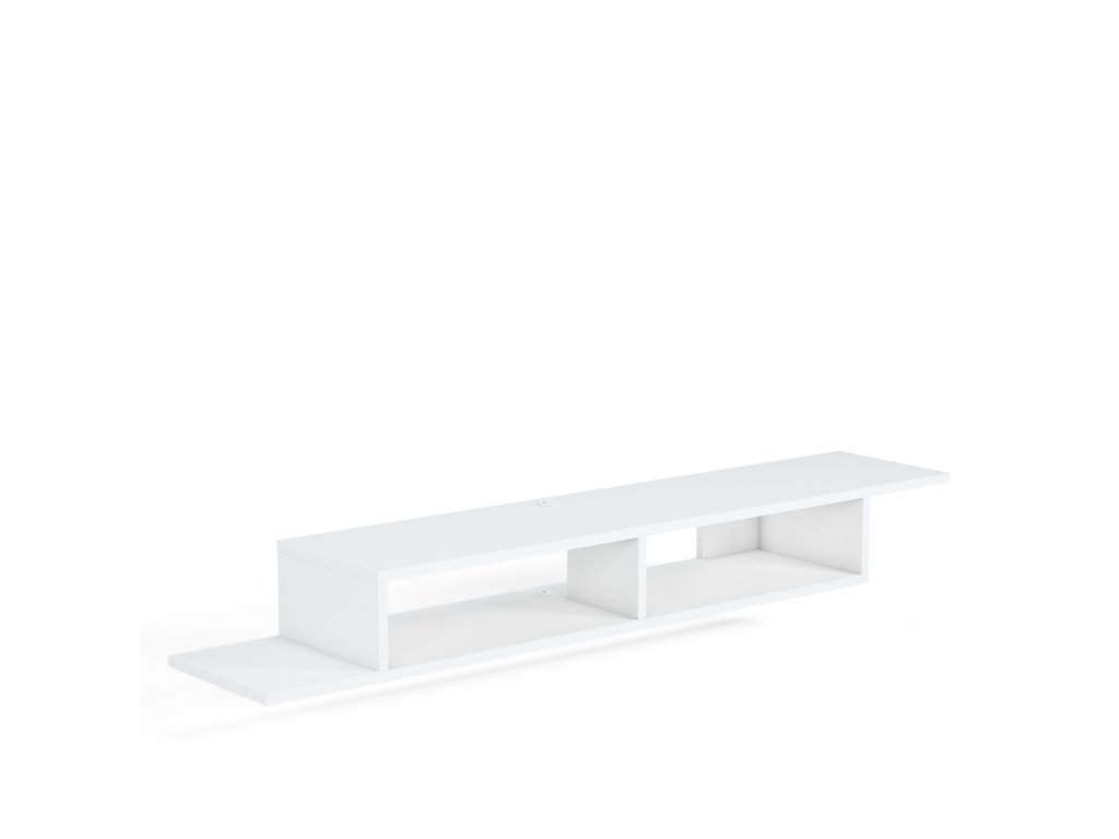 Moderní televizní stolek NUMUDIO k zavěšení na zeď s otevřenými poličkami.