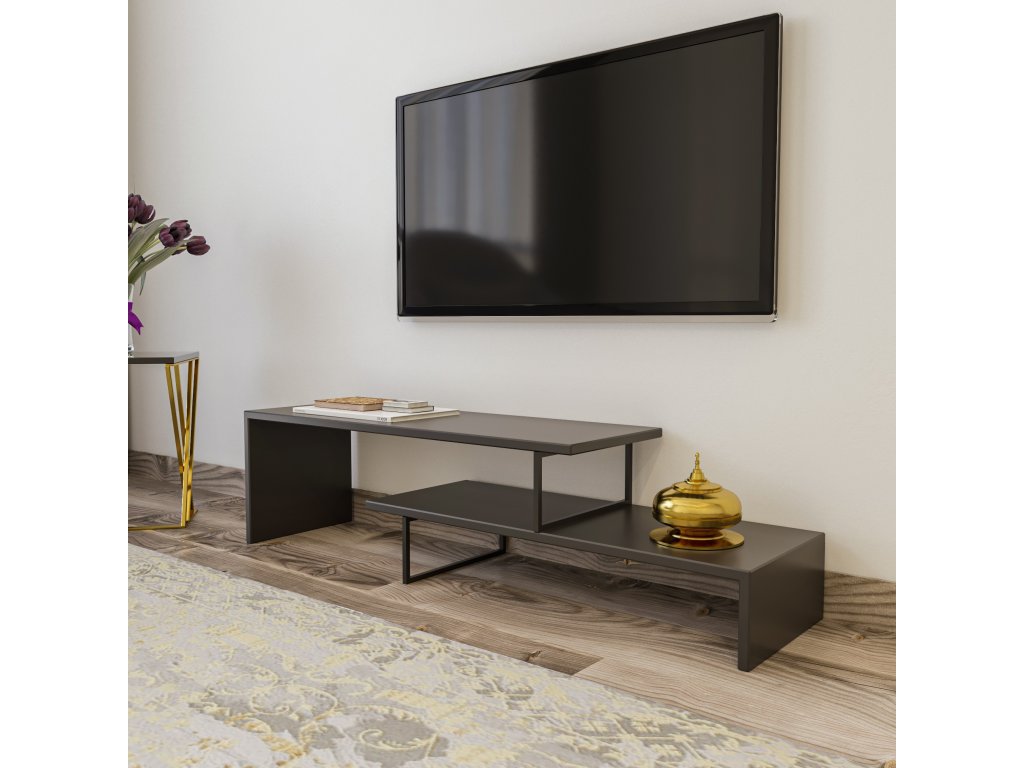 Tento jednoduchý televizní stolek je tvořen dvěma důmyslně propojenými policovými regály vyztuženými středovými kovovými rámečky.