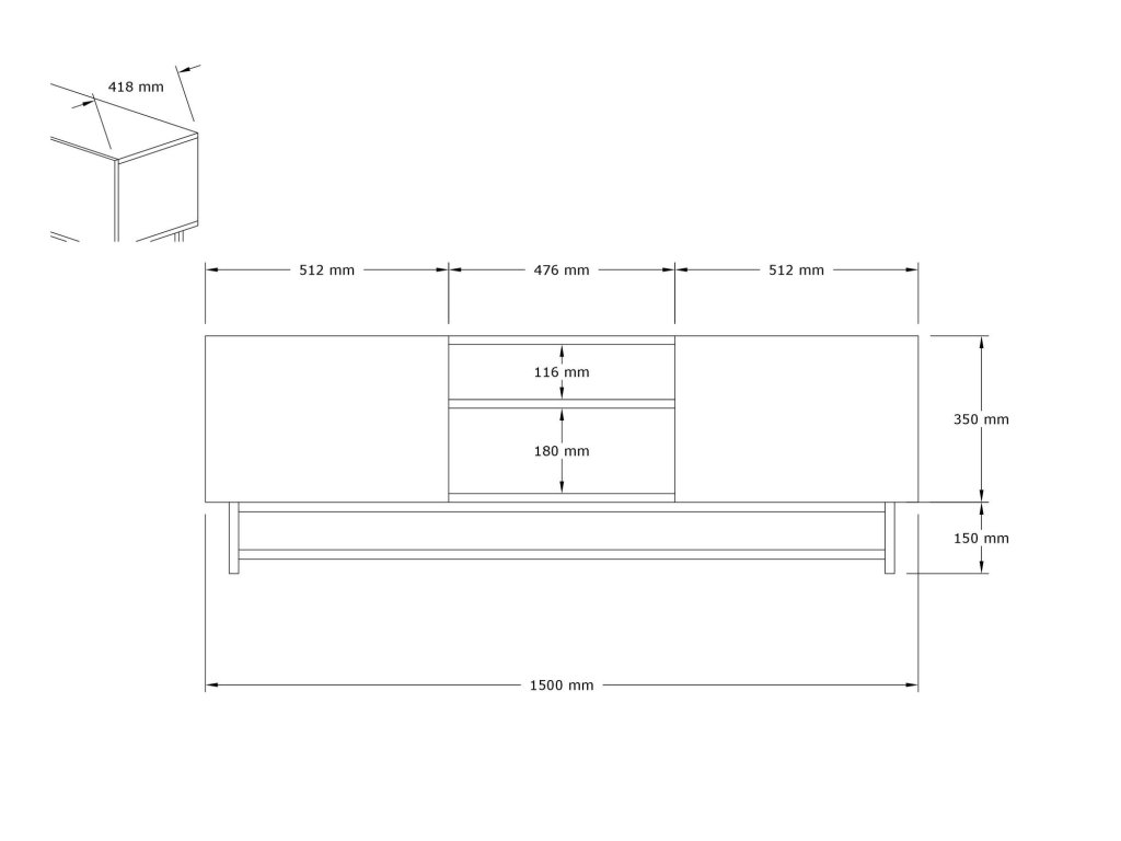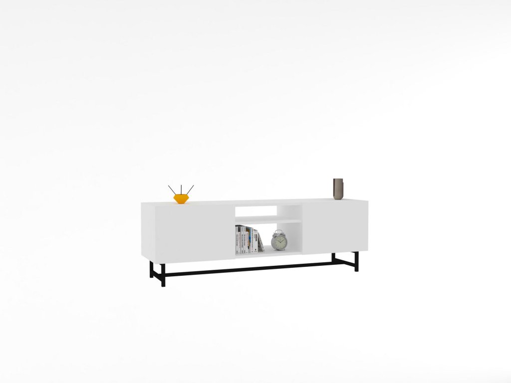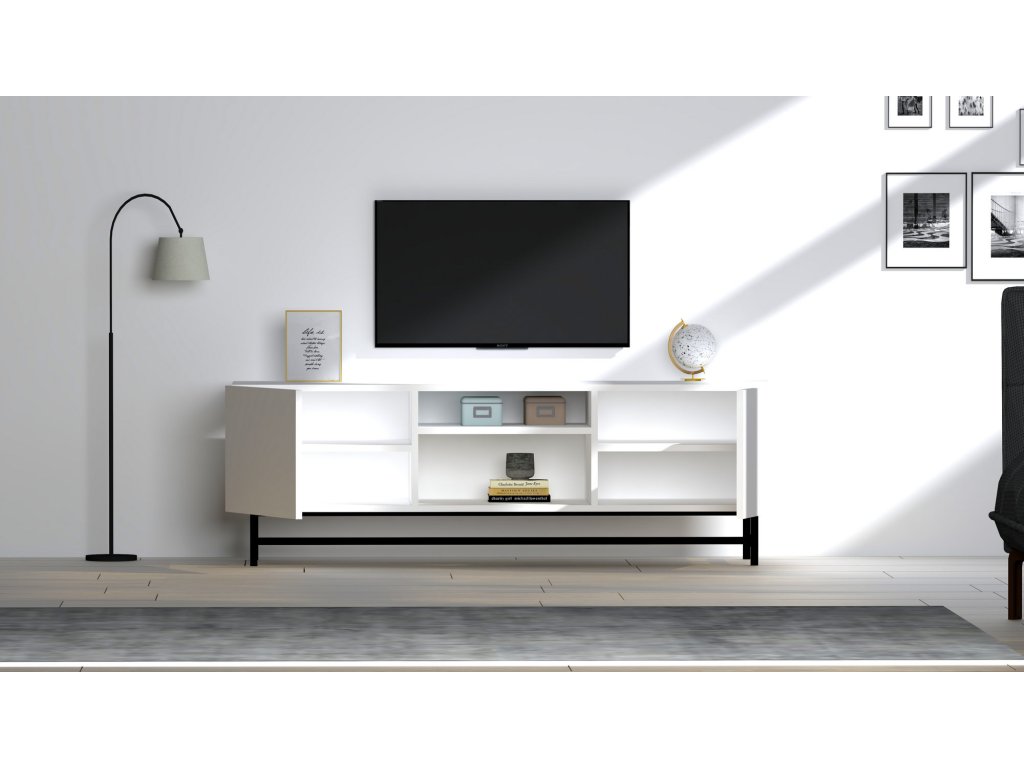 Televizní stolek má bílou barvu obdélníkový tvar a nohy jsou kovové černé.