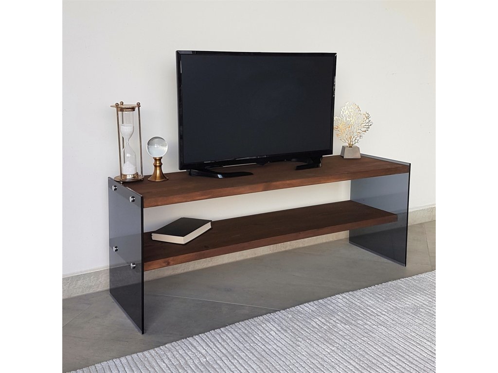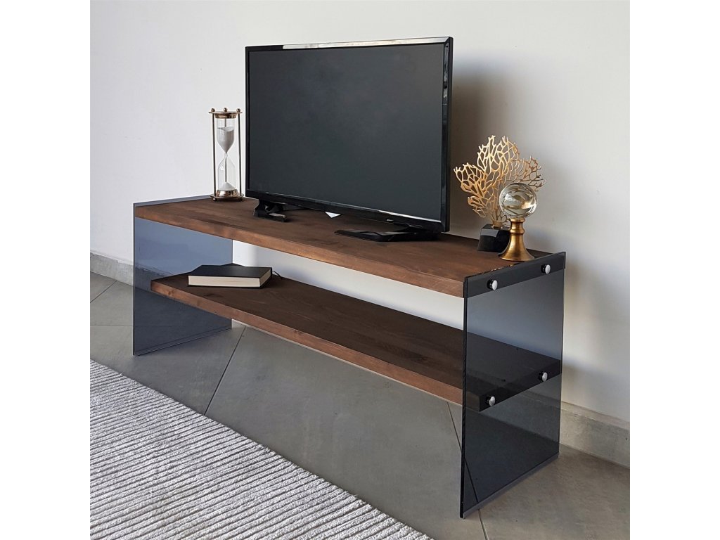 Televizní stolek TV100 má tělo v dekoru ořech, které nesou dvě skleněné bočnice, což vypadá poměrně křehce, překvapí však nosností až 20 kilogramů.
