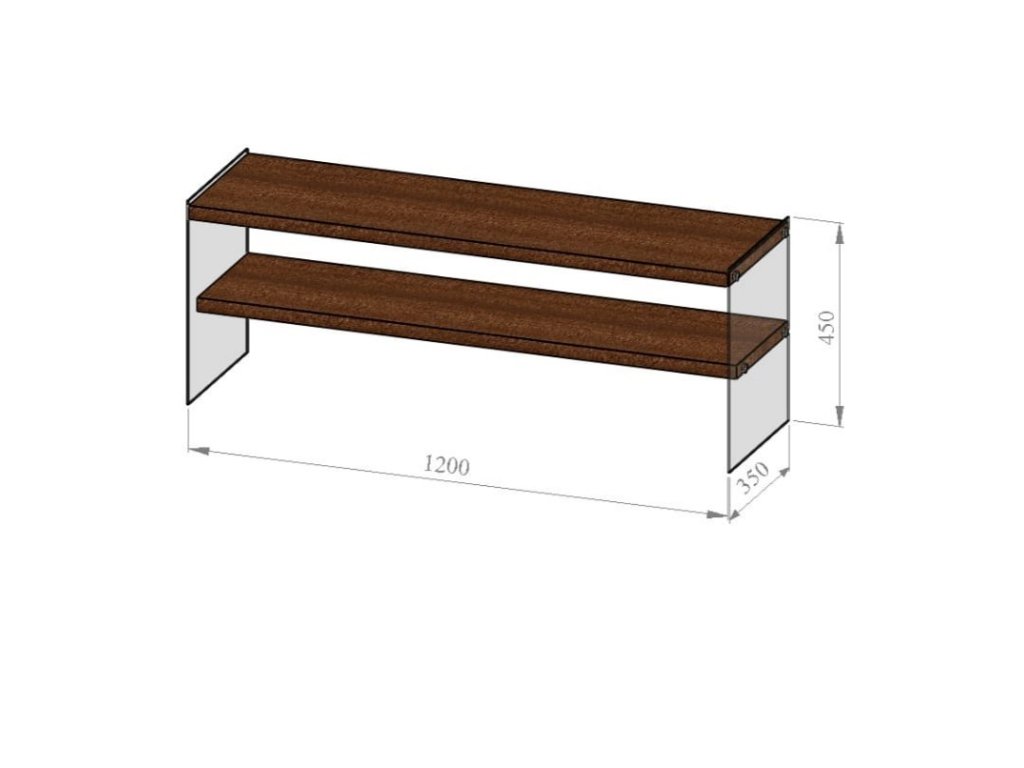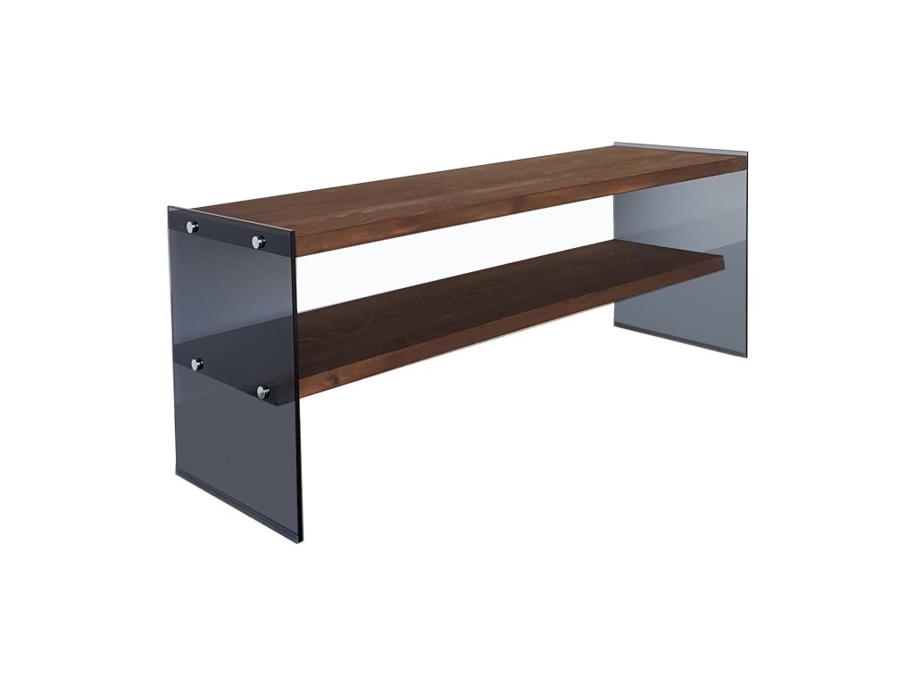 Je vyroben z desek masivní borovice v dekoru ořech a z desek z tvrzeného skla o síle 8 mm.