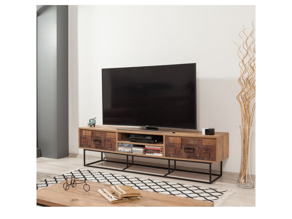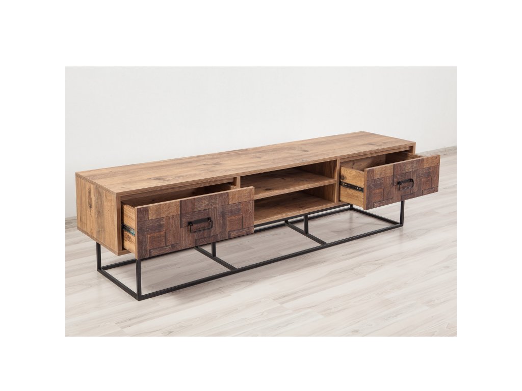 Na černém kovovém rámu usazený borovicový televizní stolek UVE je složen ze tří částí, ze dvou bočních zásuvek s teleskopickými pojezdy a s UV tiskem na čelech a ze středového otevřeného regálu.