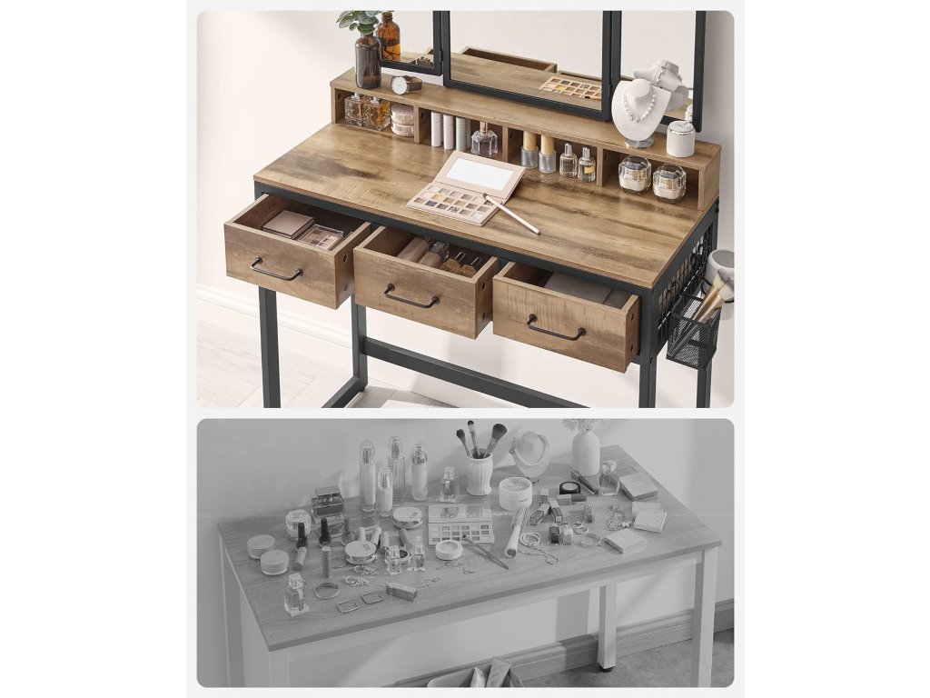 Polička na parfémy, 4 otevřené přihrádky na rtěnky, 3 zásuvky na palety a rovnátka na vlasy a 1 velká stolní deska. Tento toaletní stolek nabízí několik přihrádek, které vám umožní uspořádat všechny kosmetické produkty a bojovat proti nepořádku.