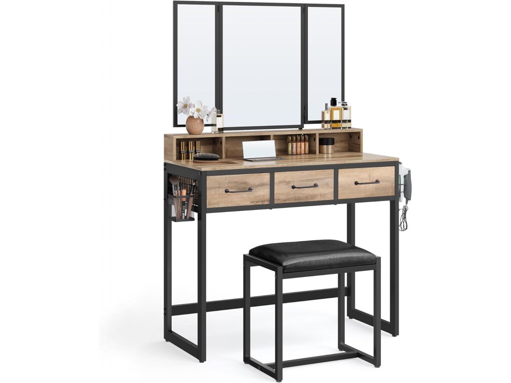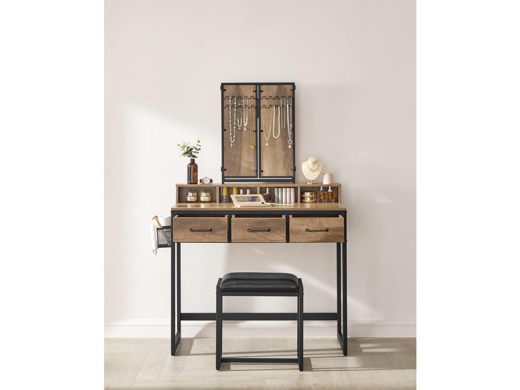 Velké zrcadlo toaletního stolku se skládá ze 3 částí. Dvě strany se sklápějí, takže si můžete zkontrolovat líčení z různých úhlů.