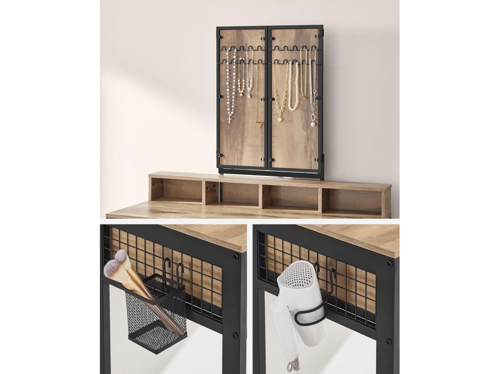 Na háčky za zrcadlem lze zavěsit náušnice, náramky a náhrdelníky. Toaletní stolek nabízí také nádobu na fén a držák na kartáče.