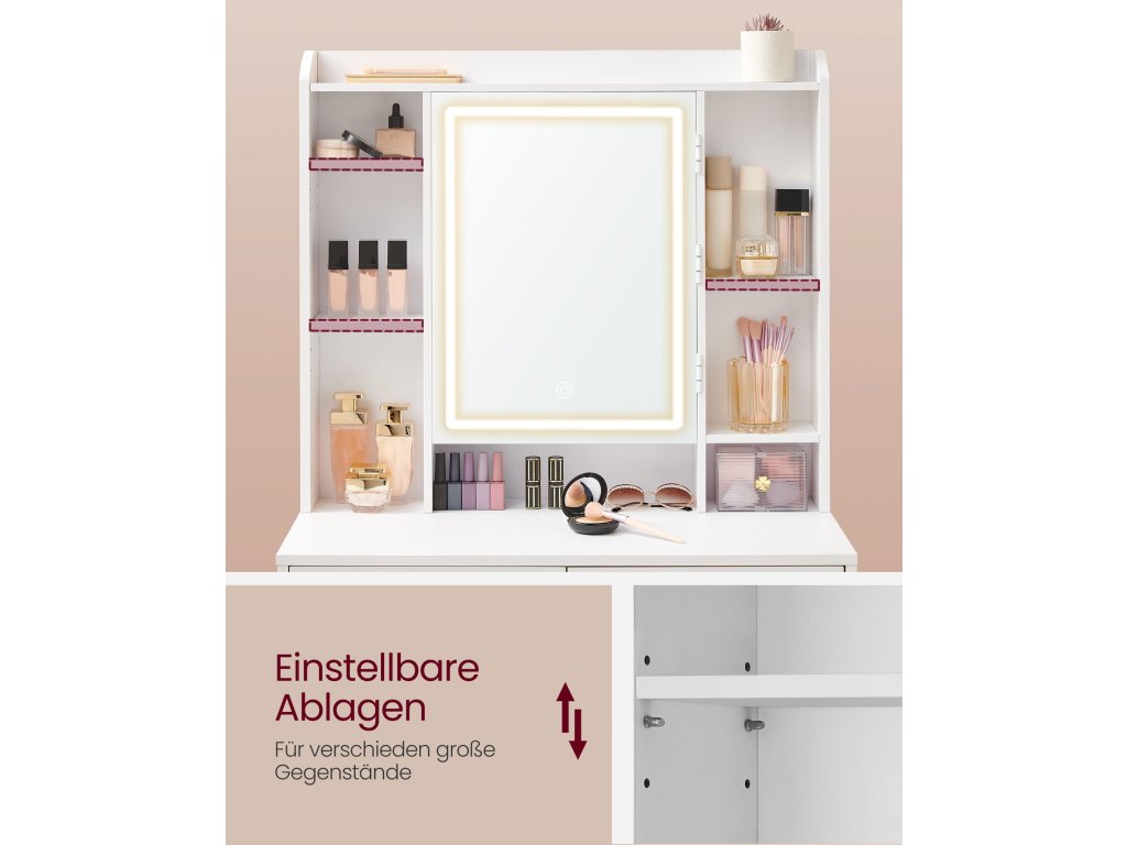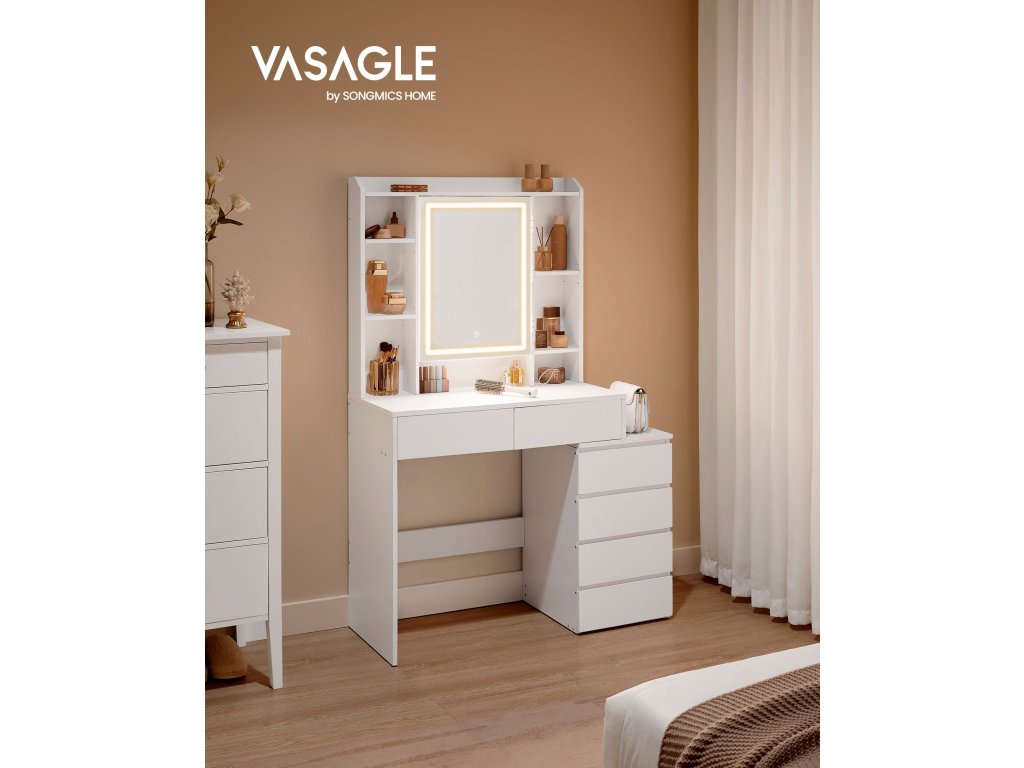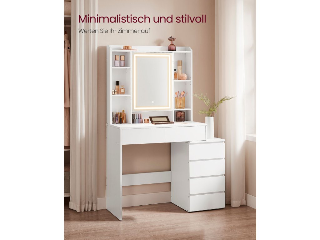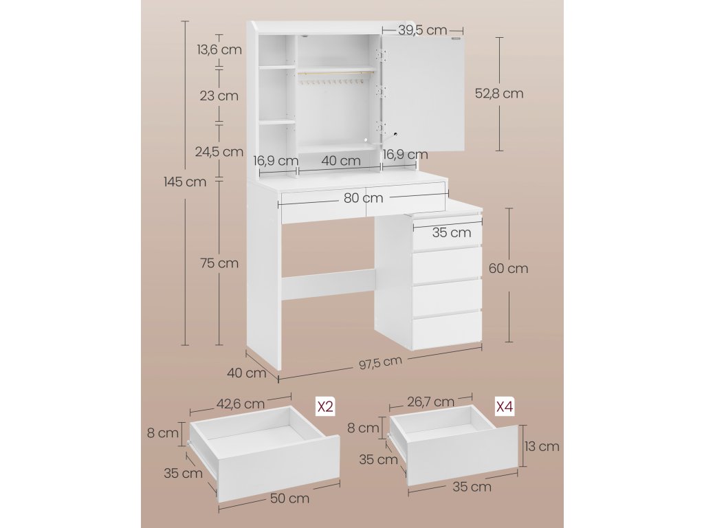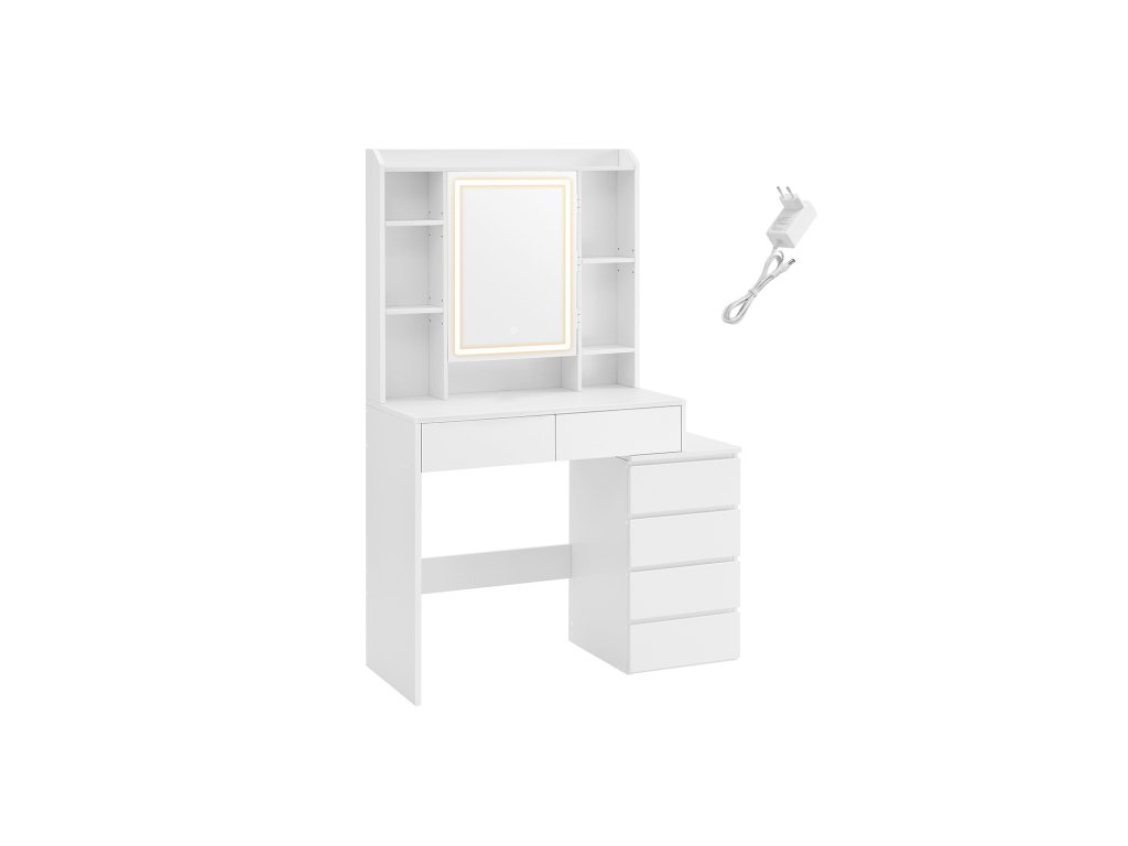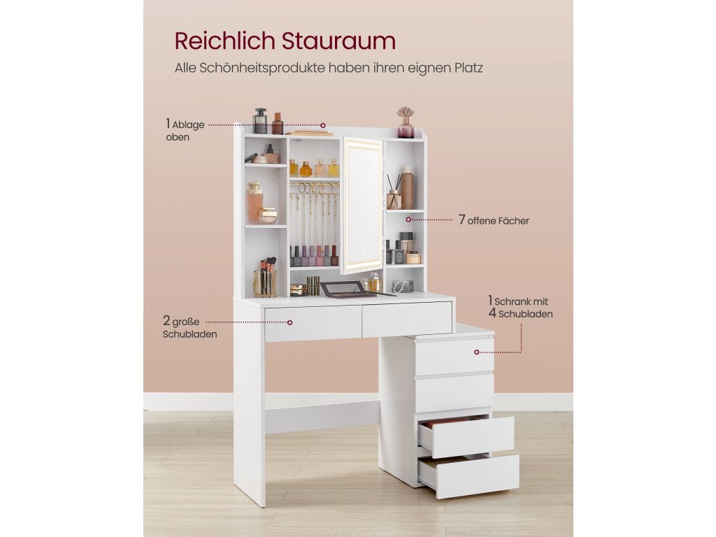 Toaletní stolek obsahuje pracovní desku, 7 otevřených přihrádek, 2 velké zásuvky, 2 police a háčky za zrcadlem a skříňku se 4 zásuvkami. Tento toaletní stolek poskytuje dostatek prostoru pro uložení všech vašich věcí v pořádku.