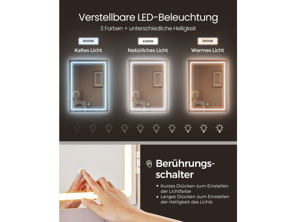 Dlouhým stisknutím vypínače nastavíte jas, krátkým stisknutím nastavíte barvu světla. LED osvětlení si můžete nastavit podle svých potřeb pro dokonalé nalíčení.
