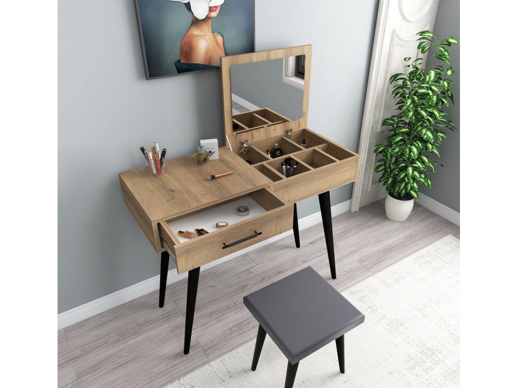 Na černých dřevěných nohách stojící komplexní v dekoru dub vyrobený toaletní stolek ROUGE nabízí svým moderním designem rozličné úložné prostory, teleskopickou zásuvku a sklopné zrcadlo.