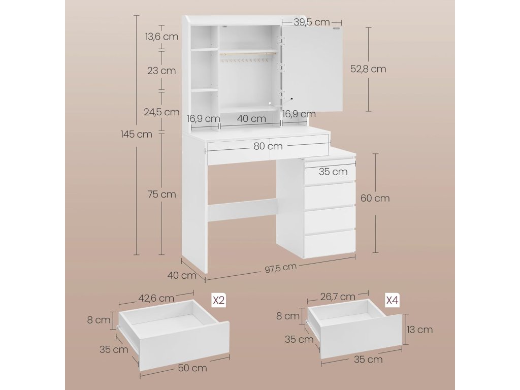 Horní police, 7 otevřených přihrádek, 2 velké zásuvky, háčky za zrcadlem, velká stolní deska a skříňka se 4 zásuvkami. Tento toaletní stolek nabízí spoustu úložného prostoru - vše má své místo.