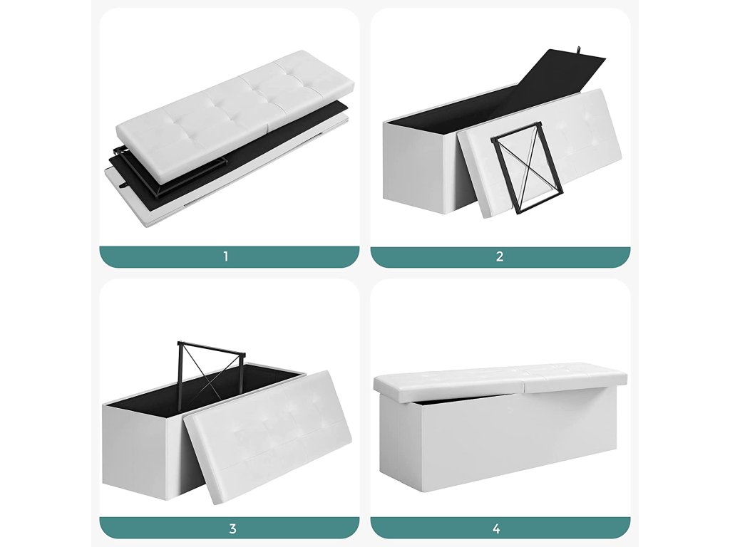 Skládací lavice s odklápěcím víkem které lze otevřít z obou stran. Praktické a rychlé vyjmutí nebo vložení předmětů bez nutnosti sundávat celé víko.