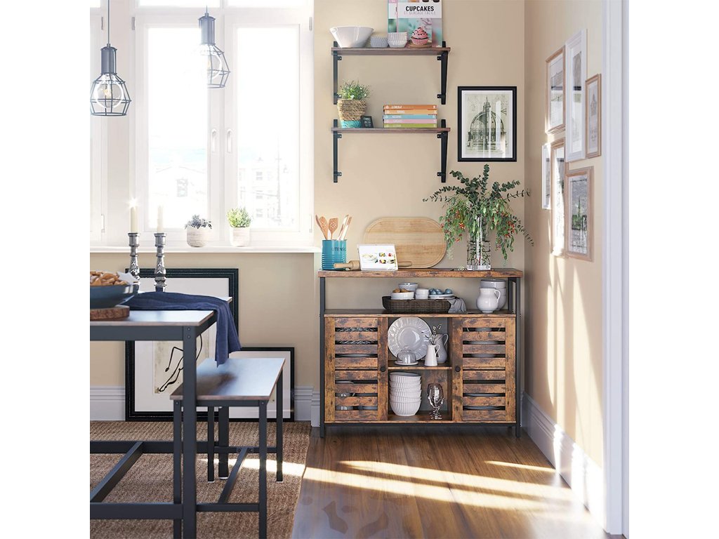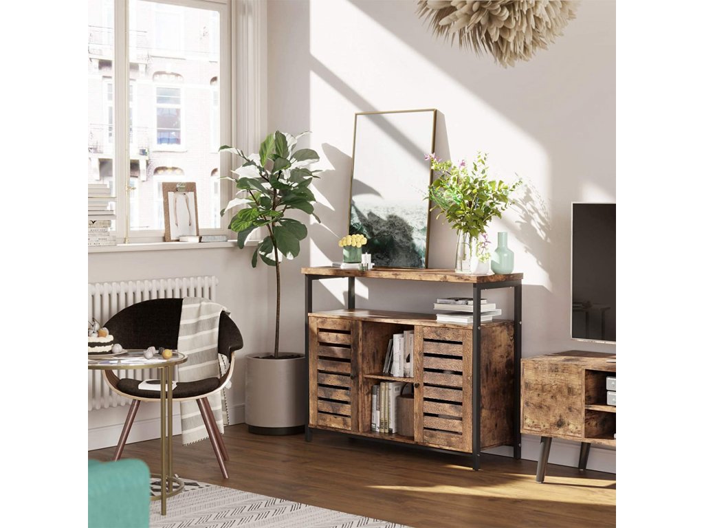 Průmyslové akcenty a rustikální dřevěné tóny vytvářejí v tomto půvabném úložném prostoru hřejivý a lákavý vzhled, díky čemuž je ideální pro vytvoření elegantního vzhledu vaší předsíně, jídelny, obývacího pokoje a dalších místností.