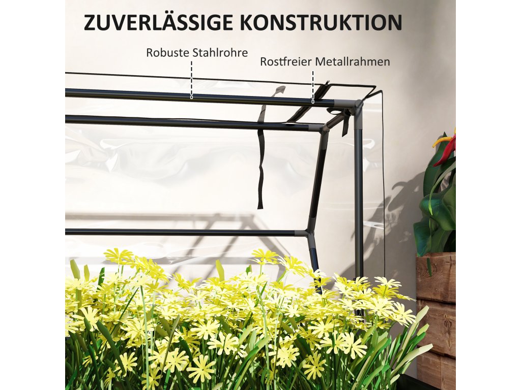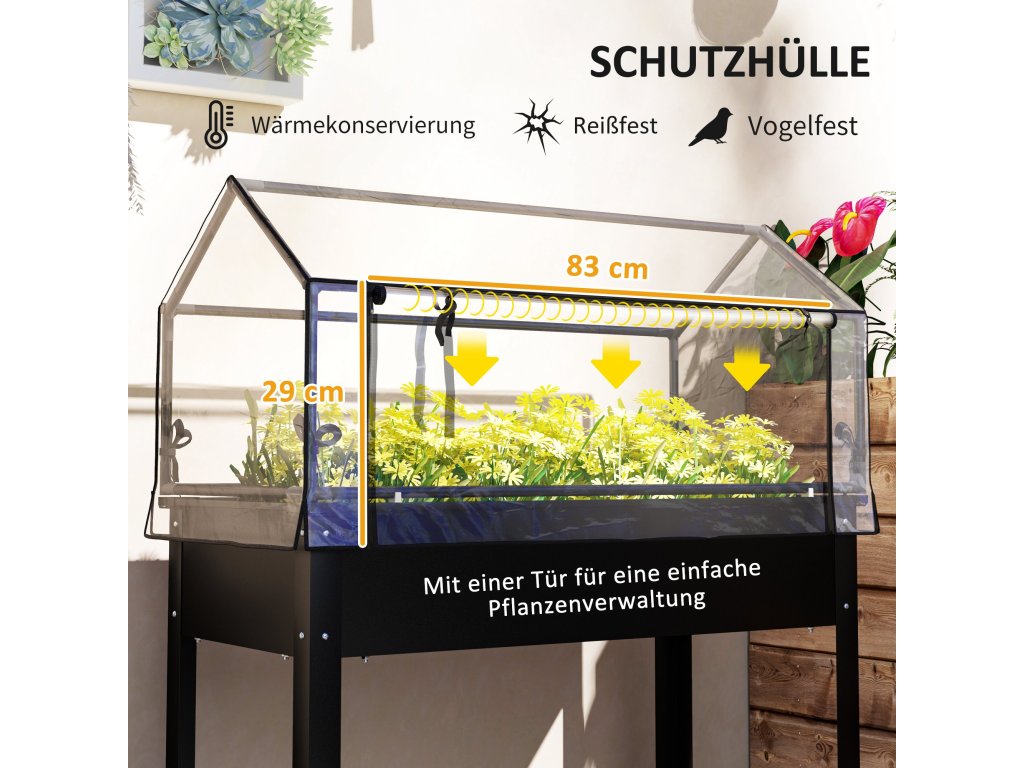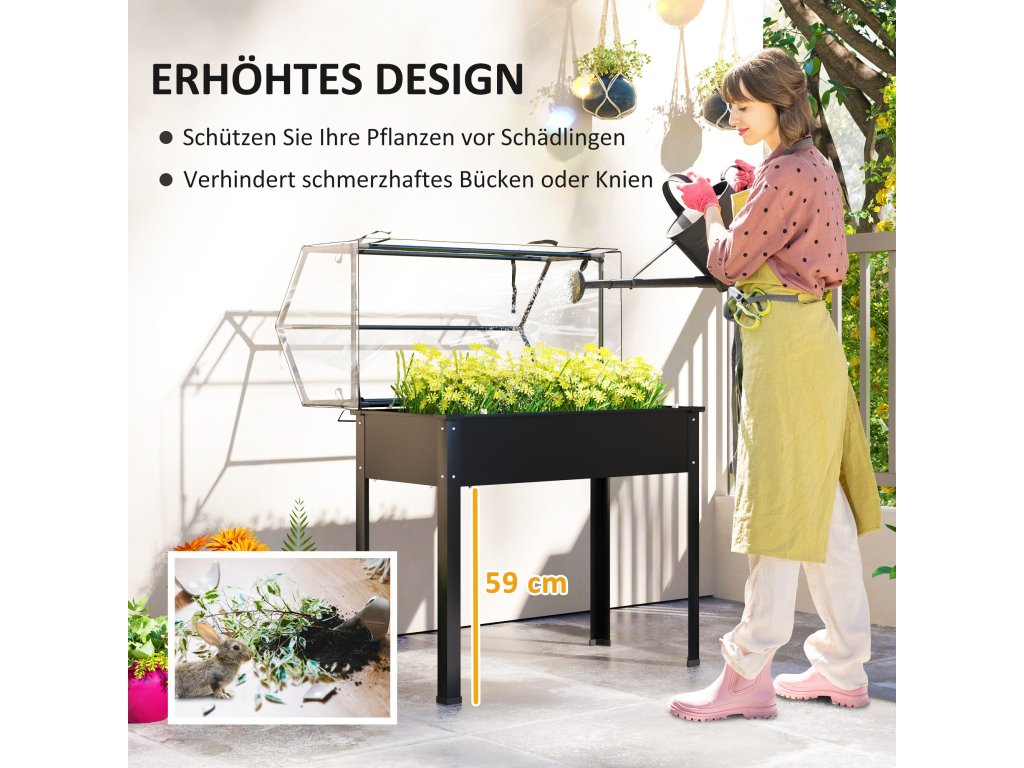 Zažijte snadné zahradničení s vyvýšeným záhonem Outsunny pro balkon! Tento zahradní box má ochranu skleníku s plastovým krytem a dvířky, která chrání vaše rostliny a udržuje je v bezpečí. Vyvýšená konstrukce truhlíku snižuje ohýbání, usnadňuje zahradničení a chrání před plevelem a škůdci. Drenážní otvor ve vyvýšeném záhonu také podporuje zdravé půdní podmínky tím, že zabraňuje přemokření.