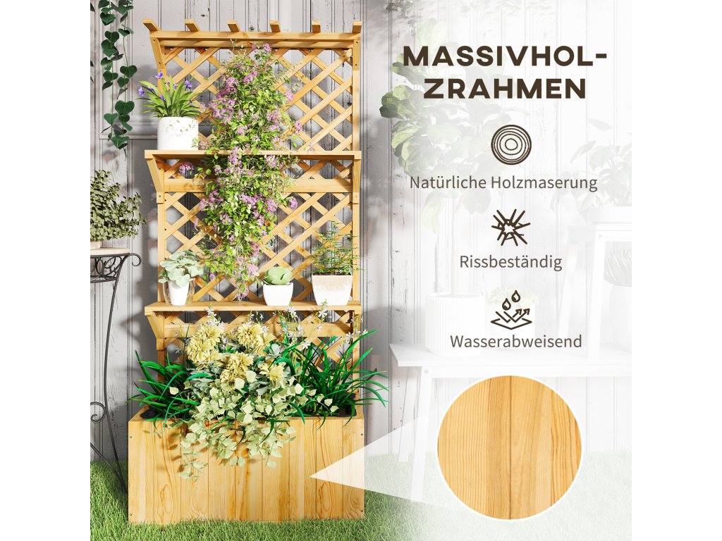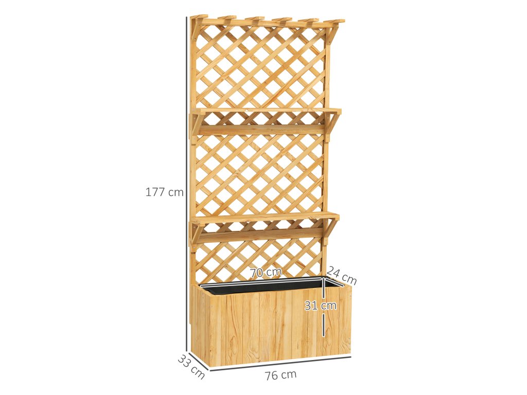 Vyzkoušejte vertikální zahradničení s kombinovaným vyvýšeným záhonem s mříží od společnosti Outsunny! Mřížka květinového truhlíku je ideální pro popínavé rostliny a nabízí střešní zábradlí a dvě police pro závěsné košíky, malé květináče a dekorace. Odtokové otvory vyvýšeného záhonu integrované do truhlíku zabraňují zamokření a zajišťují zdravý růst vaší zeleně. Elegantní a praktické řešení pro všechny příznivce zahrady!