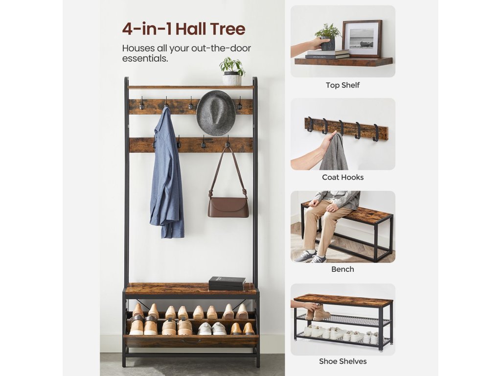 Předsíňový strom s 9 háčky, botníkem, lavicí o šířce 85 cm a horní policí vám umožní pověsit kabáty, uspořádat boty, posadit se na přezutí a vystavit oblíbené drobnosti.