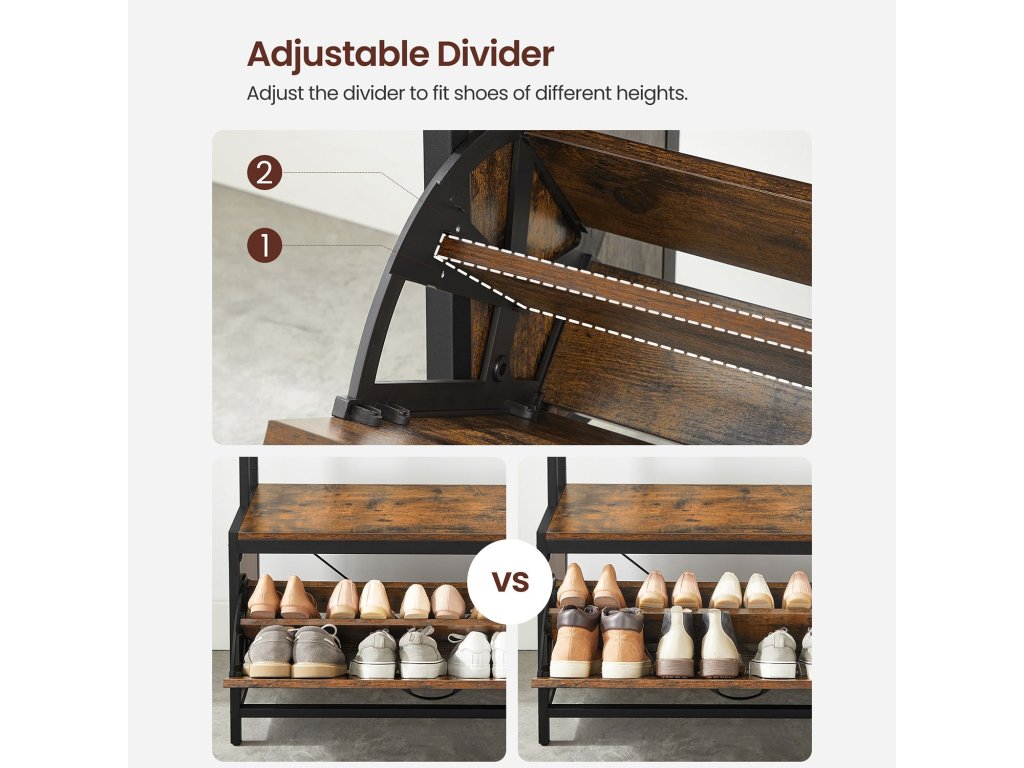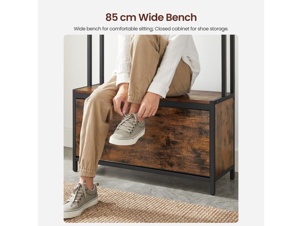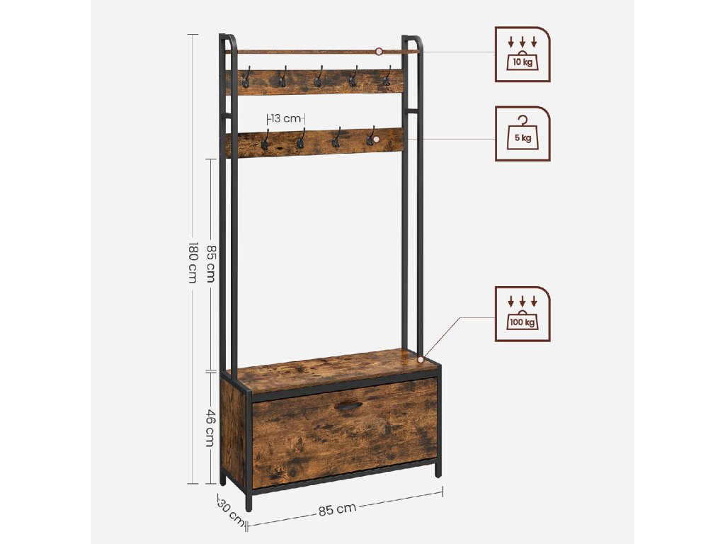 Tento předsíňový věšák, vyrobený z oceli a dřevotřísky a vyztužený V-tyčemi na zadní straně, je stabilní a udrží na lavici až 100 kg, takže na něm můžete v klidu sedět