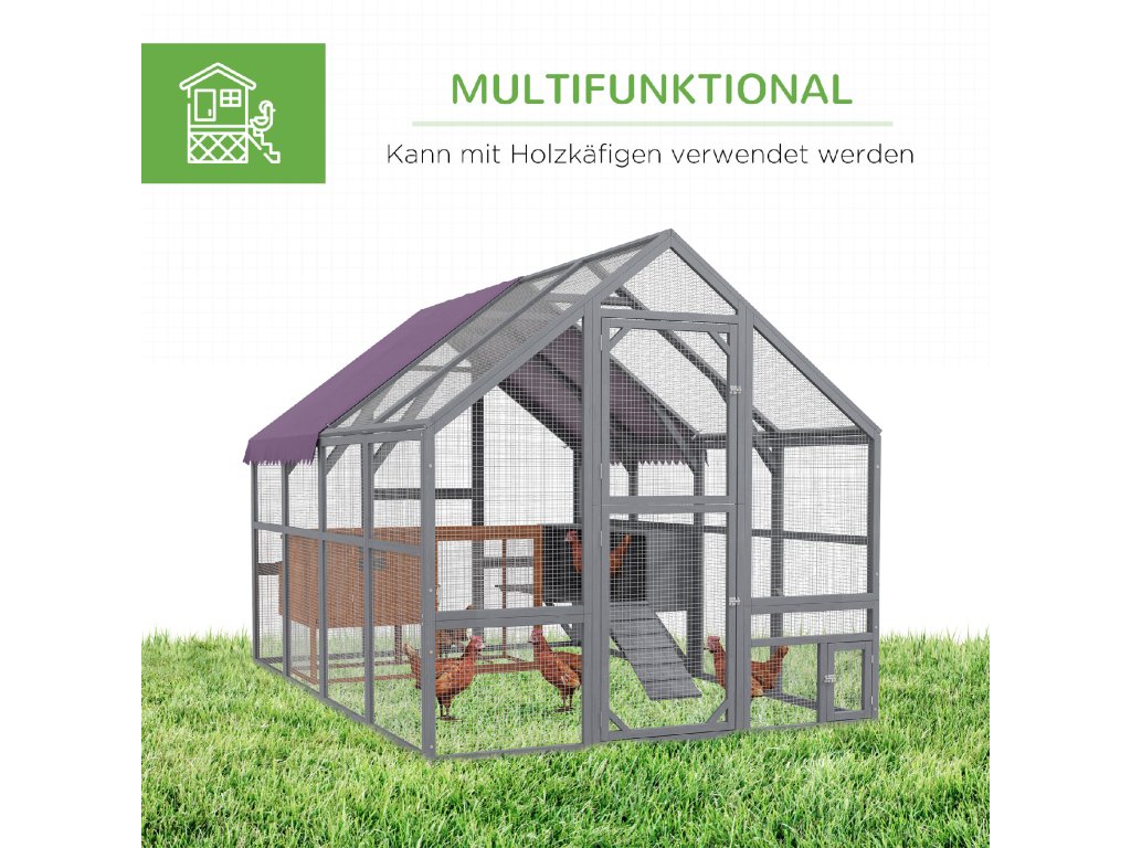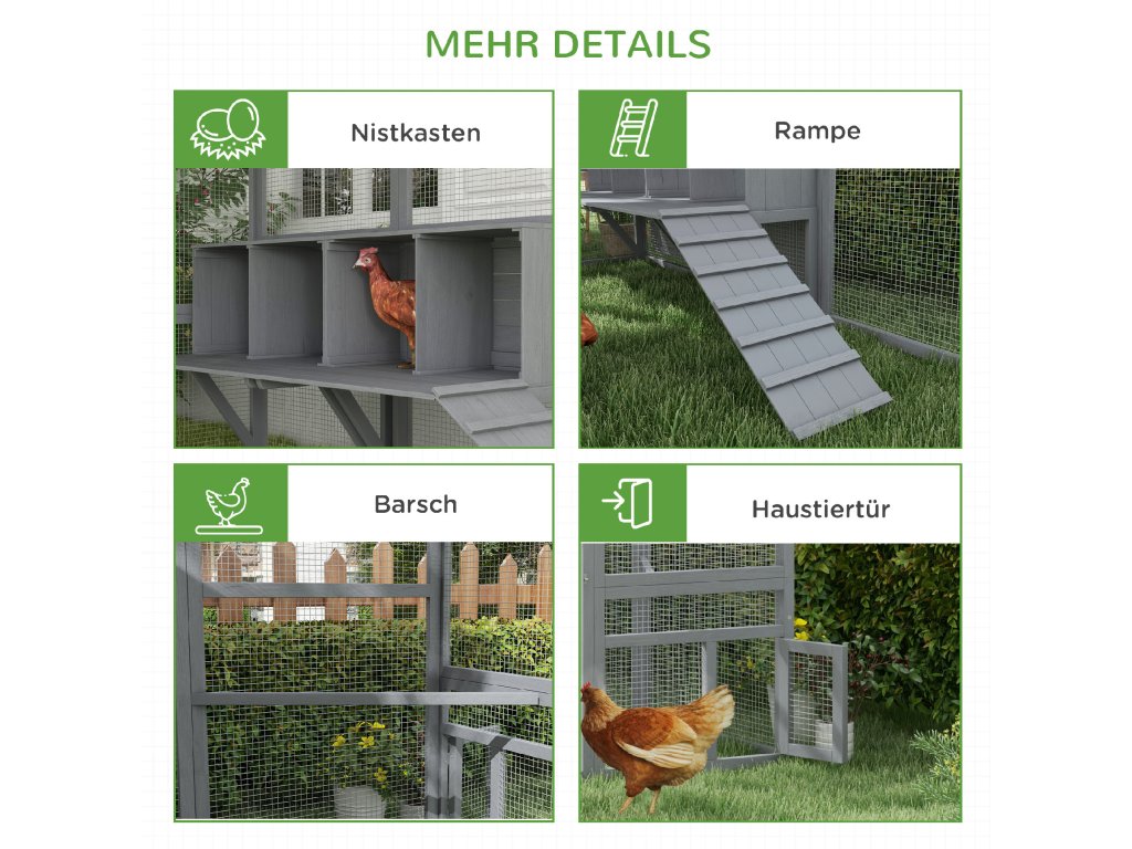 Výběh poskytuje prostorný prostor pro 8-12 kuřat a umožňuje dostatek pohybu. Krytá konstrukce poskytuje stín a ochranu před deštěm, zatímco použití materiálů odolných vůči klimatickým vlivům zajišťuje pohodu zvířat i životního prostředí. Díky hnízdnímu boxu nabízí venkovní výběh také praktickou možnost skladování vajec. Velká přední dvířka a malá vstupní dvířka umožňují vám i vašim zvířatům snadný přístup do venkovního výběhu.