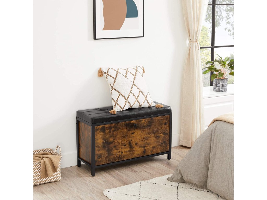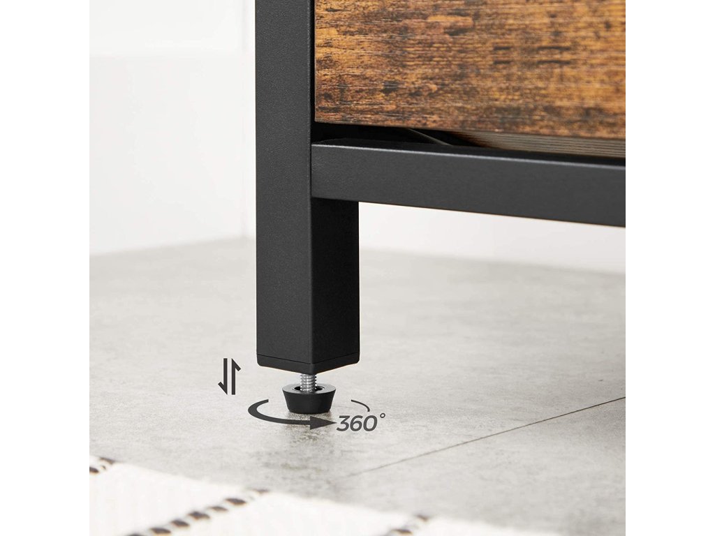 Je vyrobený z černého ocelového rámu, z kvalitních MDF desek hnědé rustikální barvy a z černého PU polstrování.