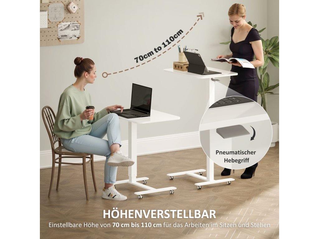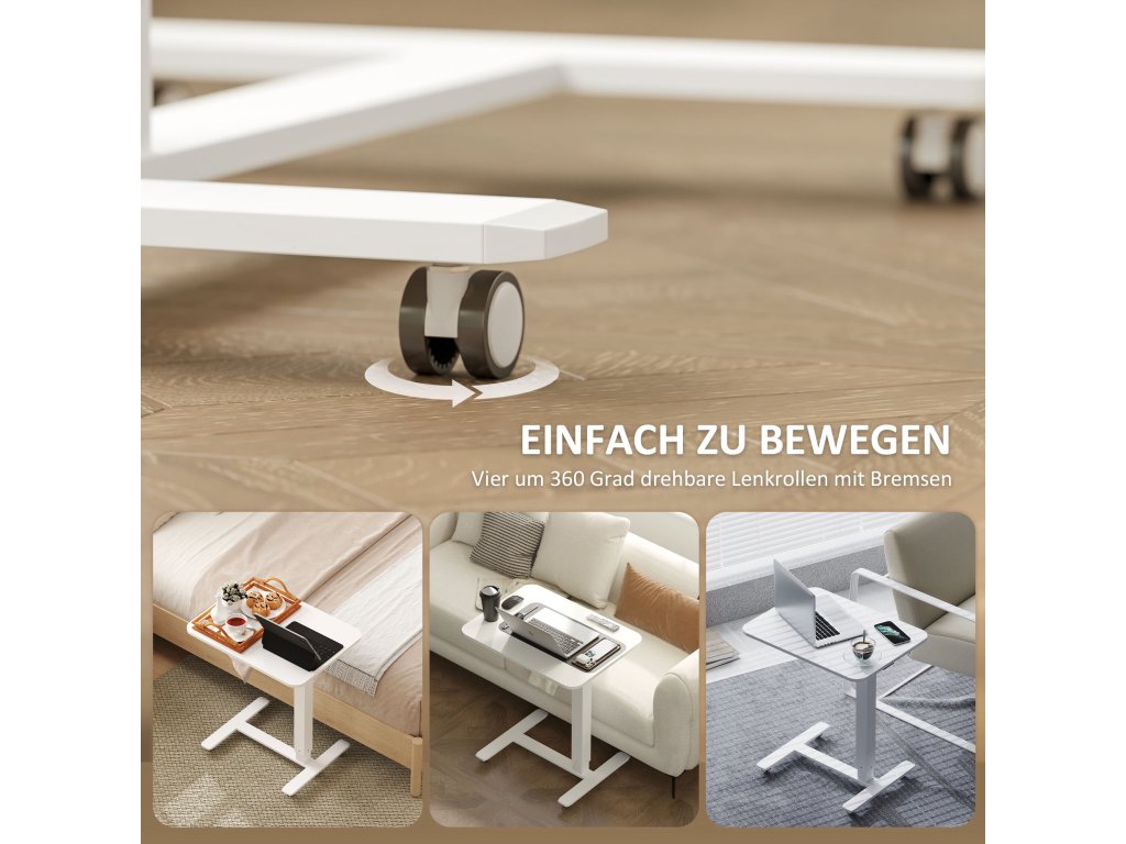 S tímto stolkem na notebook od společnosti HOMCOM můžete pracovat kdekoli a kdykoli. Díky kolečkům s rozsahem 360 stupňů jej můžete kamkoli přemístit. Díky kompaktnímu formátu je ideální pro použití v malých prostorách. Díky výškovému nastavení se můžete sami rozhodnout, zda budete raději pracovat vestoje, nebo vsedě. Zvýšený okraj zajistí, že vaše pera a mobilní telefon zůstanou na místě, i když je deska stolu nakloněná. Tento stolek na notebook je chytrým řešením pro mobilní práci.