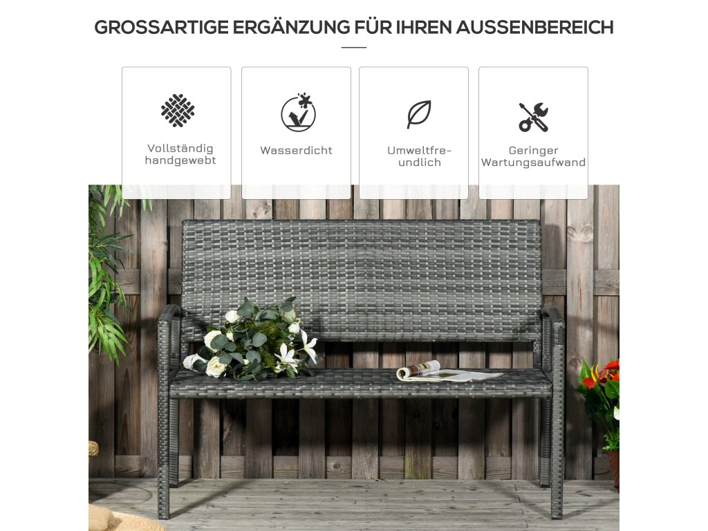 Naše polyratanová lavice od společnosti Outsunny je vynikající volbou pro chvíle odpočinku v domácí zeleni. Zahradní lavice má robustní ocelový rám, zatímco sedák a opěradlo jsou vyrobeny z ručně tkaného umělého ratanu, který zajišťuje vysokou úroveň pohodlí při sezení a optimální odolnost vůči povětrnostním vlivům. To znamená, že se na ni mohou pohodlně usadit až dvě osoby a strávit venku báječné chvíle plné odpočinku. Přivítejte teplé letní dny!