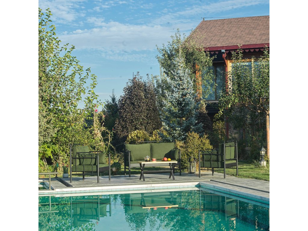 Sestava stylového zahradního nábytku s ozdobným kovovým rámem, lepenými lamelami pro větší pohodlí a pohodlným bohatým polstrováním pro extra pohodlí.
