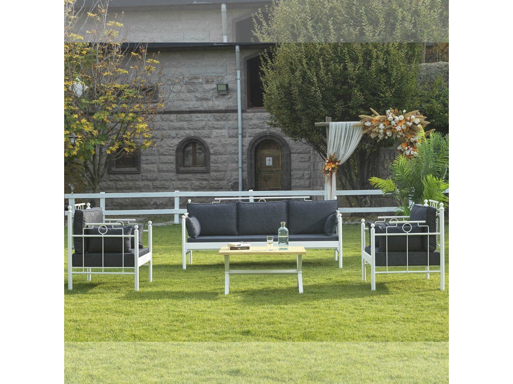 Sestava stylového zahradního nábytku s ozdobným kovovým rámem, lepenými lamelami pro větší pohodlí a pohodlným bohatým polstrováním pro extra pohodlí.