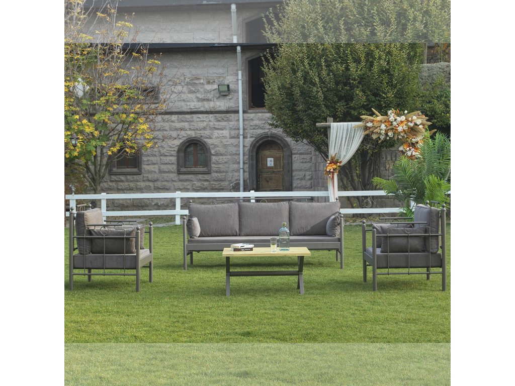 Sestava zahradního nábytku obsahuje pohodlnou pohovku pro tři, na které se můžete bez problémů natáhnout, dvě křesla s polstrováním a konferenční stolek.