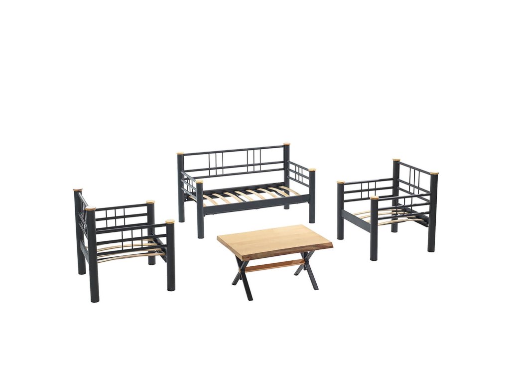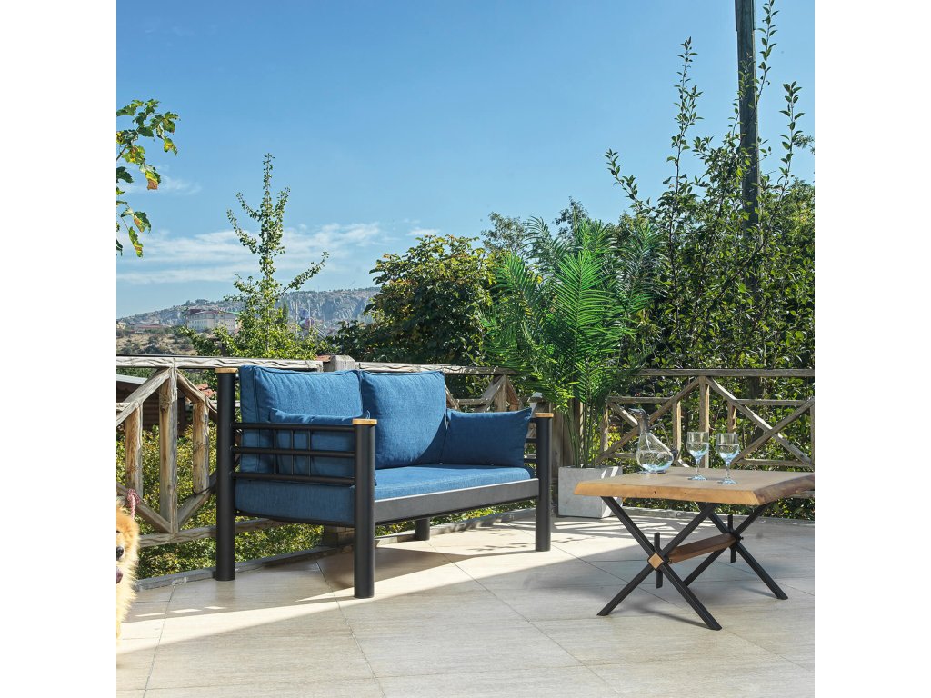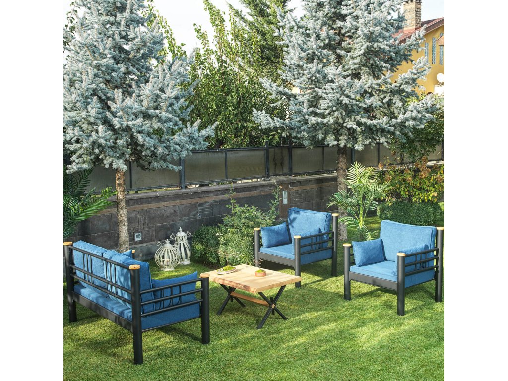 Moderní sestava kovového zahradního nábytku obsahuje pohodlnou pohovku pro dva, dvě křesla s bohatým polstrováním a stolek se zajímavou deskou. Sedáky jsou navíc odpruženy lepenými lamelami, na pohodlí je zde kladen velký důraz