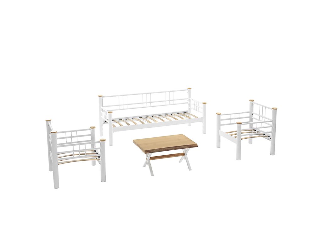 Moderní sestava kovového zahradního nábytku obsahuje pohodlnou pohovku pro tři, dvě křesla s bohatým polstrováním a stolek se zajímavou deskou. Sedáky jsou navíc odpruženy lepenými lamelami, na pohodlí je zde kladen velký důraz