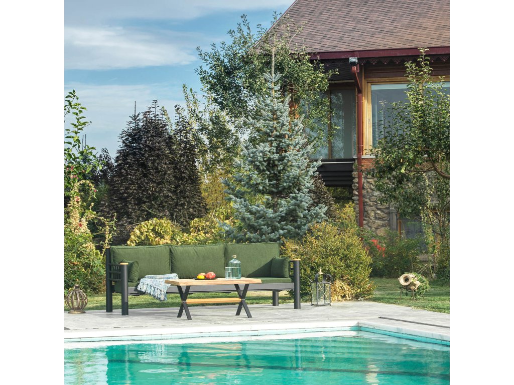 Moderní sestava kovového zahradního nábytku obsahuje pohodlnou pohovku pro tři, dvě křesla s bohatým polstrováním a stolek se zajímavou deskou. Sedáky jsou navíc odpruženy lepenými lamelami, na pohodlí je zde kladen velký důraz