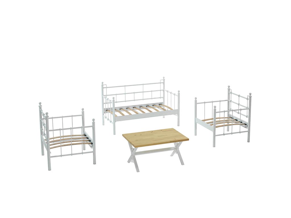 Zahradní nábytek s kovovým rámem obsahuje pohodnou dvoumístnou pohovku, dvě křesla s lepenými lamelami a pohodlnými polštáři a konferenční stolek s kovovou konstrukcí.