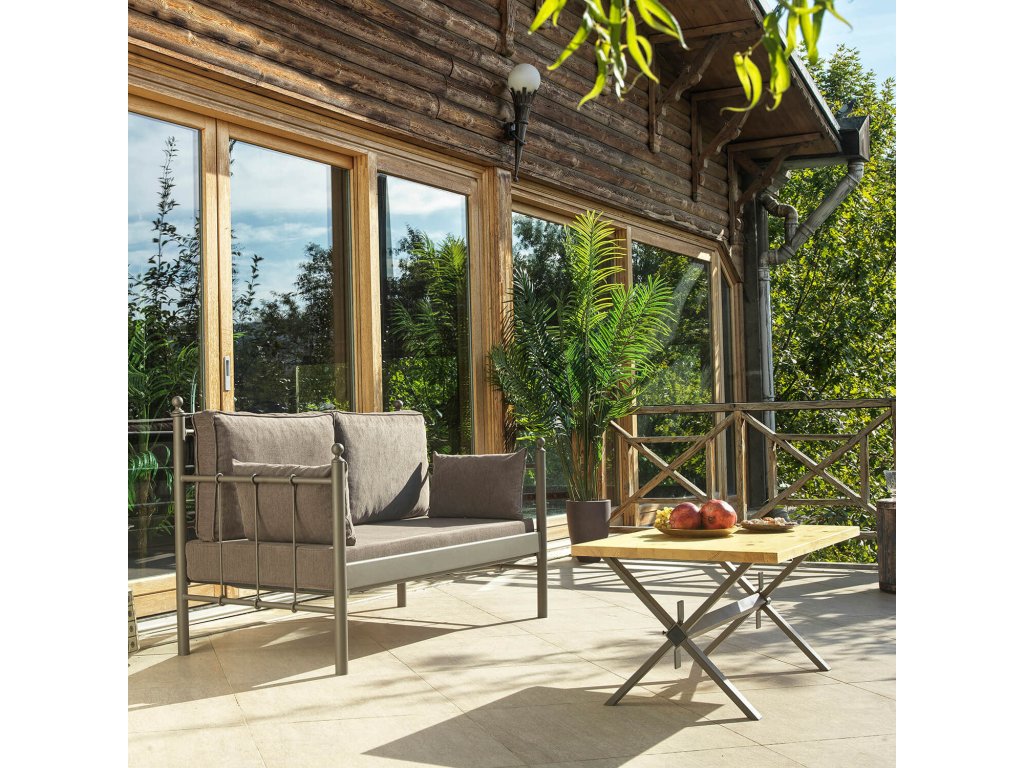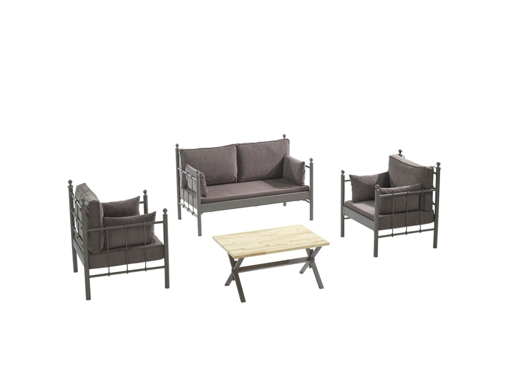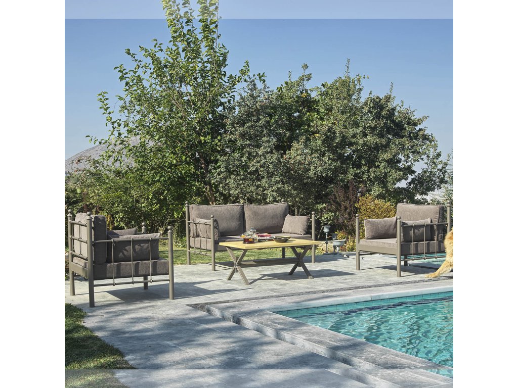 Zahradní nábytek s kovovým rámem obsahuje pohodnou dvoumístnou pohovku, dvě křesla s lepenými lamelami a pohodlnými polštáři a konferenční stolek s kovovou konstrukcí.